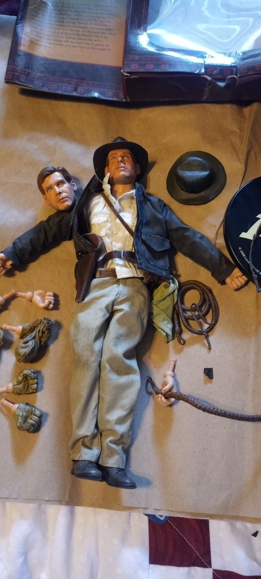 This SideShow Collectibles action figure Raiders of the Lost Ark is a must-have for any fan of the iconic movie. Standing at 12 inches tall and made of high-quality plastic, this figure comes with a variety of accessories including a gun, whip, jacket, gloves, belt, shirt, boots, figure stand, pants, and hat. With its 1:6 scale and original packaging, this figure is a great addition to any collection. Whether you're a collector or just looking for a gift for a fellow Indiana Jones fan, this figure is sure to impress. Don't miss out on the chance to own a piece of movie history. NOTES PLEASE READ: BLISTER PAKAGING IS MISSING. BOX HAS HEAVEY DAMAGE BACK OFF JACKET HAS DISCOLORATION/ STAIN? SCUF ON BOOTS Scuff on pant leg Signs of expected use. See photos ask questions