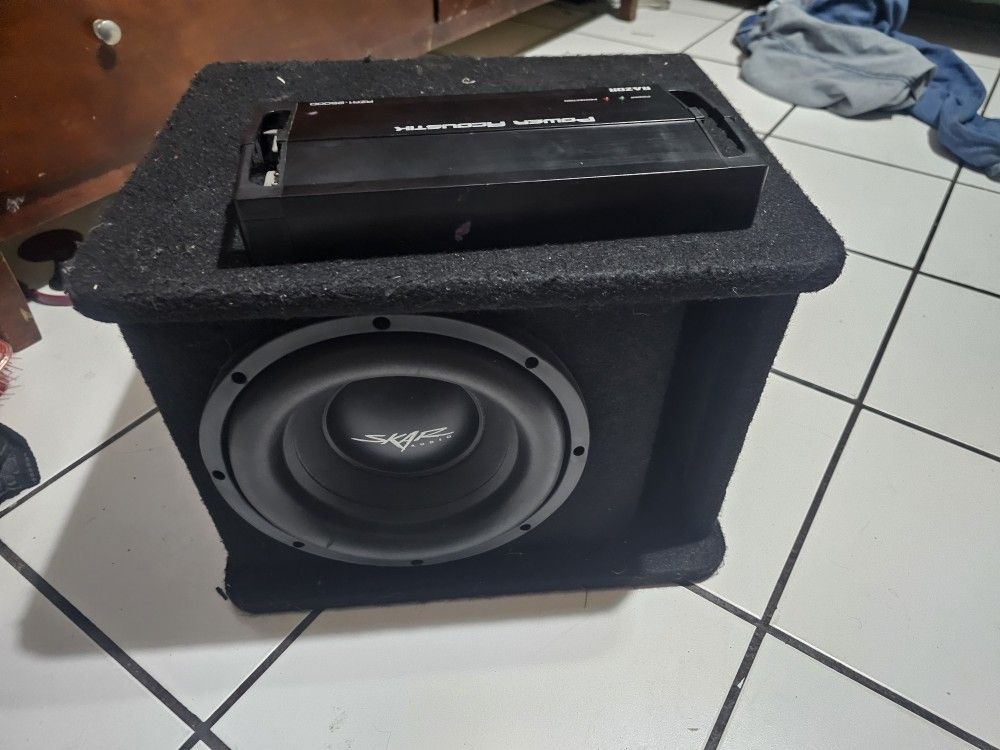Selling this 10 skar subwoofer and amp. Works good no longer need them upgraded for to 2 10s n bigger amp Well come with a new wiring kit 4 gauge Asking 300 with the wiring kit or 250 with out
