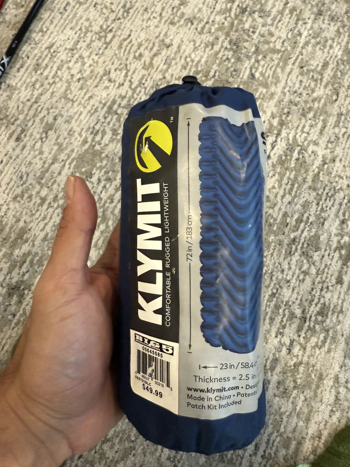 Selling a Klymit full-size sleeping pad, perfect for backpacking, camping, and outdoor adventures. Lightweight, compact, and easy to inflate, this pad provides comfort on the trail without weighing you down. Details: • Dimensions: 72” L x 23” W x 2.5” thick • Weight: 18.1 oz (514 grams) – super lightweight for backpacking • Inflation: Quick and easy – inflates in 10–15 breaths • Condition: Gently used, no leaks, clean and ready for camping • Features: Lightweight, comfortable, durable, compact for travel Stay comfortable on the trail with this lightweight, easy-to-pack sleeping pad—perfect for hikers, campers, and backpackers. Klymit sleeping pad, full-size sleeping pad, lightweight sleeping pad, backpacking gear, camping gear, hiking gear, outdoor gear, inflatable sleeping pad, trail sleeping pad, compact sleeping pad, 72x23 sleeping pad, 2.5 inch thick pad, Klymit pad used, ultralight sleeping pad