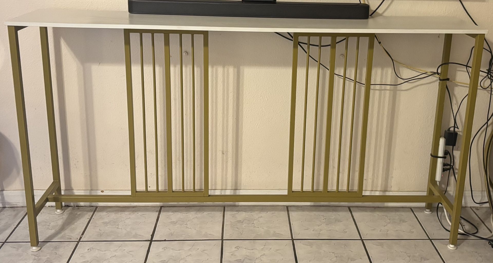 Gold frame, with a white table top. I’m good condition, no scratches or wood chips. OBO . Cannot deliver. Pick up only