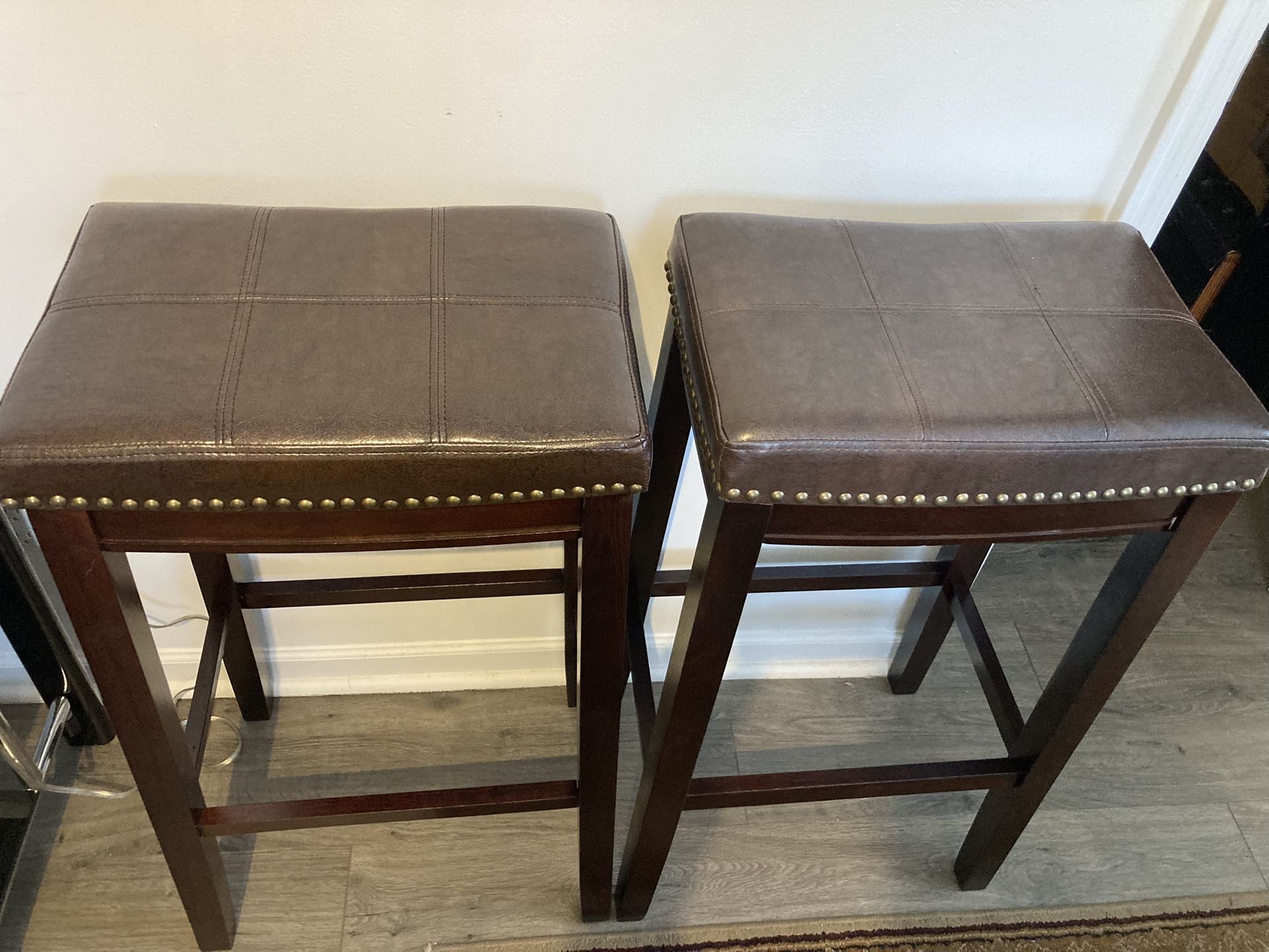 Heavy duty teak wood horse saddle studded brand new each $35. Pick in Cary height 32” Seat leather brown and me light tan measurrments 12x17.5” beautiful stools