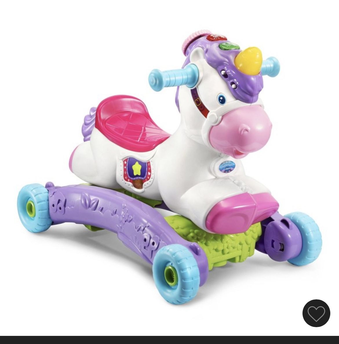 Used in ok condition Only works at a rocker and ride toy Learning and Sounds doesn’t work Needs a good cleaning Unicorn has a transformable base to change it from a rocker to a ride ok toy