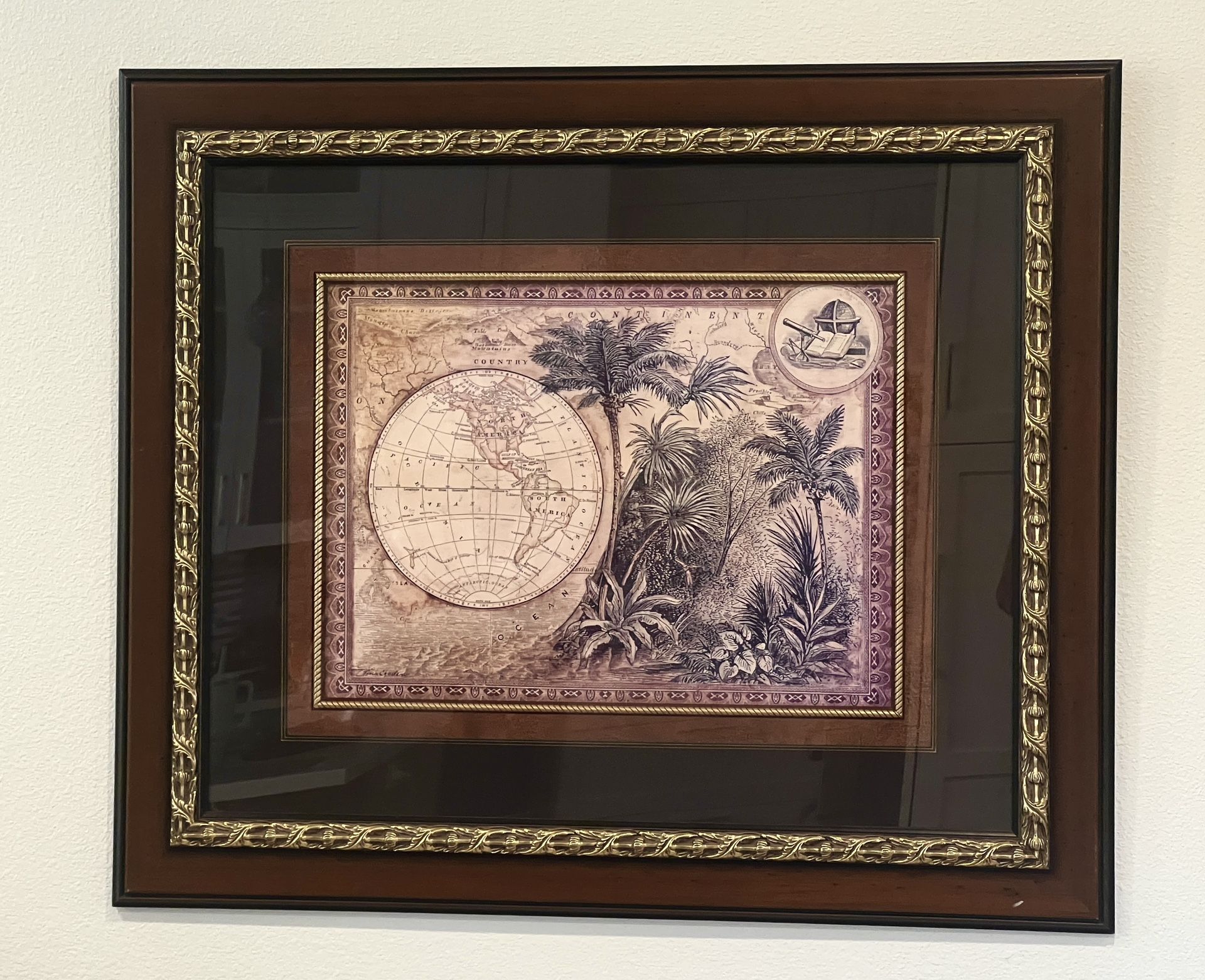 Old World Explorer Map accented by palm and island foliage - eye catching 3D mat outlined with gold toned trim - surrounded by a brown heavy duty solid wood frame with brass embellishments - all safely sealed under glass - ready to hang. ..... the frame + mat work would cost more to duplicate than the price for this finished piece. [A coordinating complimentary smaller set of palm prints with similar frames is available in a separate post.] Dimensions: 39"W x 33"H Thanks for checking out all my listings