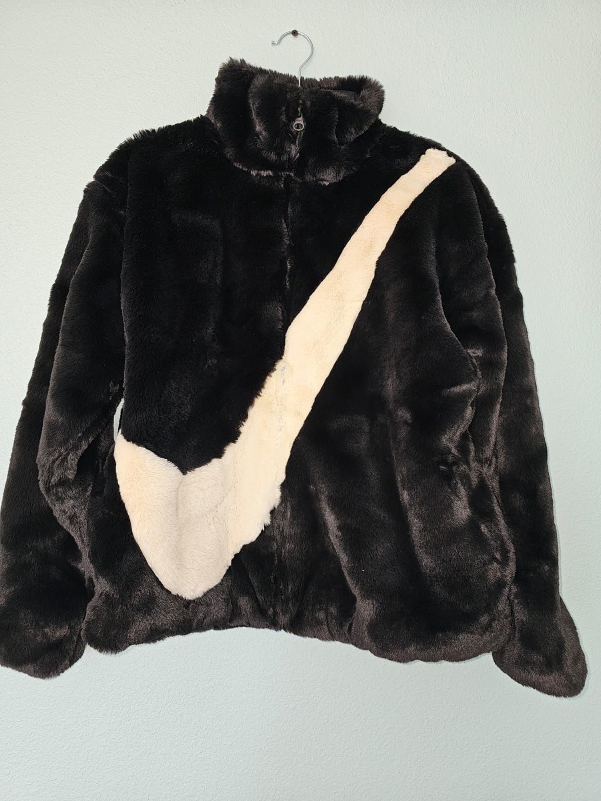 • Brand New/ Perfect condition Go beyond bold. An oversized Swoosh logo meets luxe faux fur in a wear-anywhere jacket. Pair it with sweats to keep it casual, or dial it up with other rich fabrics to bring the heat to cooler months. Big Style, Soft Feel The warm faux-fur jacket has an oversized Swoosh graphic that makes a statement. Secure Fit Elastic at the cuffs and hem helps keep the jacket in place. Storage on the Go Side pockets will help keep your hands warm and your essentials secure. Product Details Oversized fit for a baggy, spacious feel