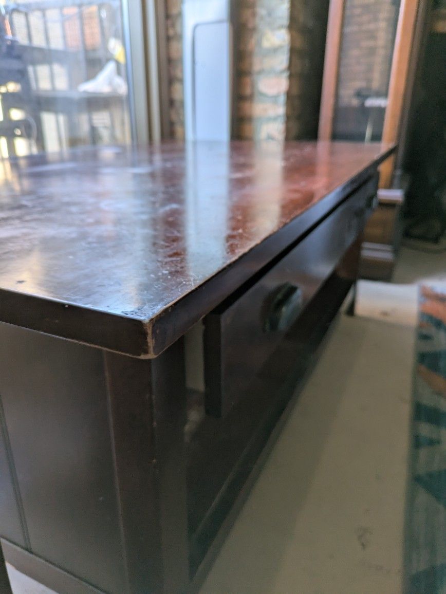Older wood, heavyweight coffee table that needs sanding. Great project. 50"L×30" W×20"H Matching End Table for sale 24x24x24