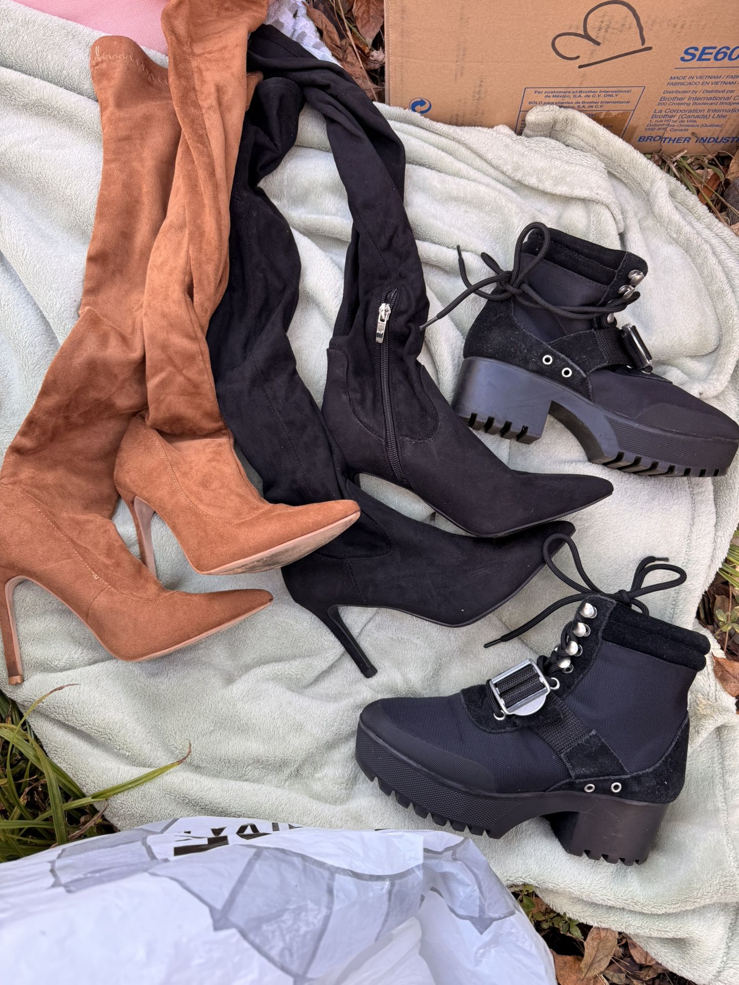 Bundle of three pairs of women’s boots, all size 5.5, sold together only. Includes: • Tan over-the-knee heeled boots (Forever brand) • Black over-the-knee heeled boots • Black chunky heel ankle boots Great mix of dressy and casual styles—perfect for fall and winter outfits. Condition: Pre-owned. Normal wear on soles and light cosmetic wear consistent with use (see photos). All still wearable and stylish. Details: • Size: Women’s 5.5 (all three pairs) • Heel styles: stiletto & chunky heel • Sold as a bundle only Price: $60 for all three pairs Great deal—priced to move.