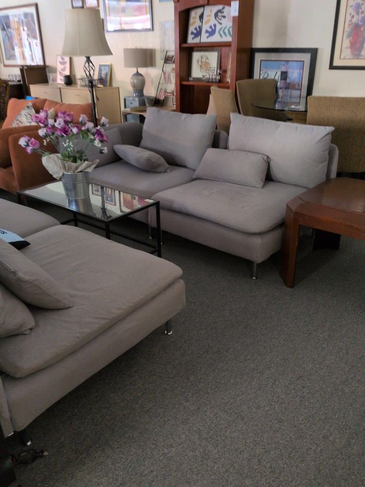 Grey linen couch modern Arrange as you like to fit your room. Priced to sell. $185 No delivery must pick up. 100 St Jude's Street Boulder City Open from 10-4 today Hours Weds in thru Sunday 10-4