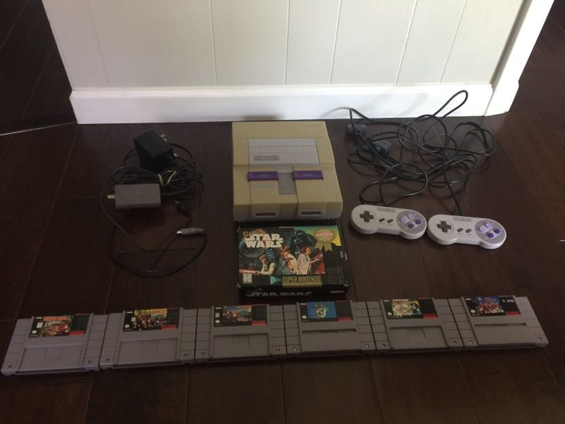 SNES and all games work. The games are in mint condition. Looking to sell whole set but will sell games individually for right price. No low ballers please. The Star Wars game is complete with game, box, dust cover and sleeve. Donkey Kong Country - 30 DK 2 - 30 DK 3 - 40 Super Mario World - 25 Mario All Stars - 30 Super Soccer Champ - 15 Star Wars- 35 SNES - 80 Sell all for 240
