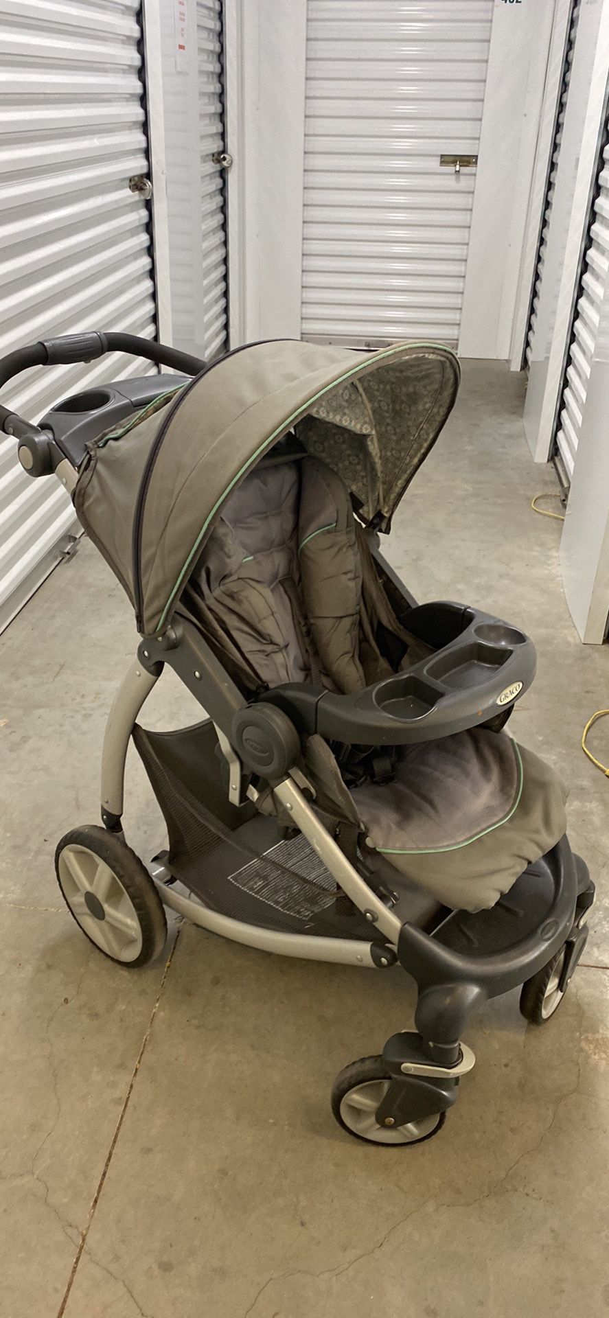 In Good condition. I really loved this stroller. Specially when there was no place to change my baby, I would use this stroller, because it can go all the way down. Perfect for naps and like a changing table.