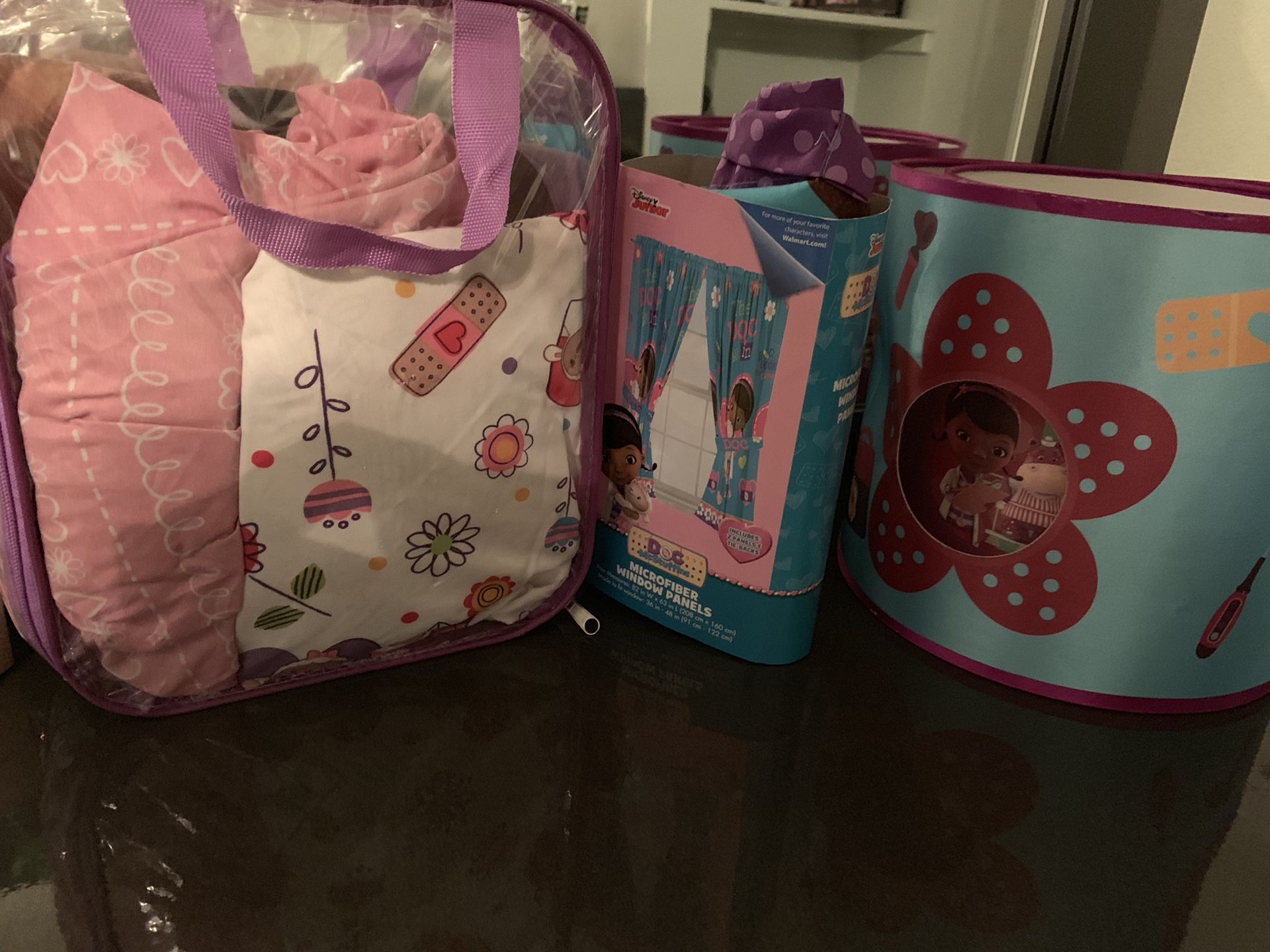 Rarely used , NEED GONE Toddler bed set everything included 2 panel curtains & Doc lamp cover (slight dent, as shown in pic) $25,$20,15 price sold separately or ALL for $60 FCFS, No holds , will meet within range‼️
