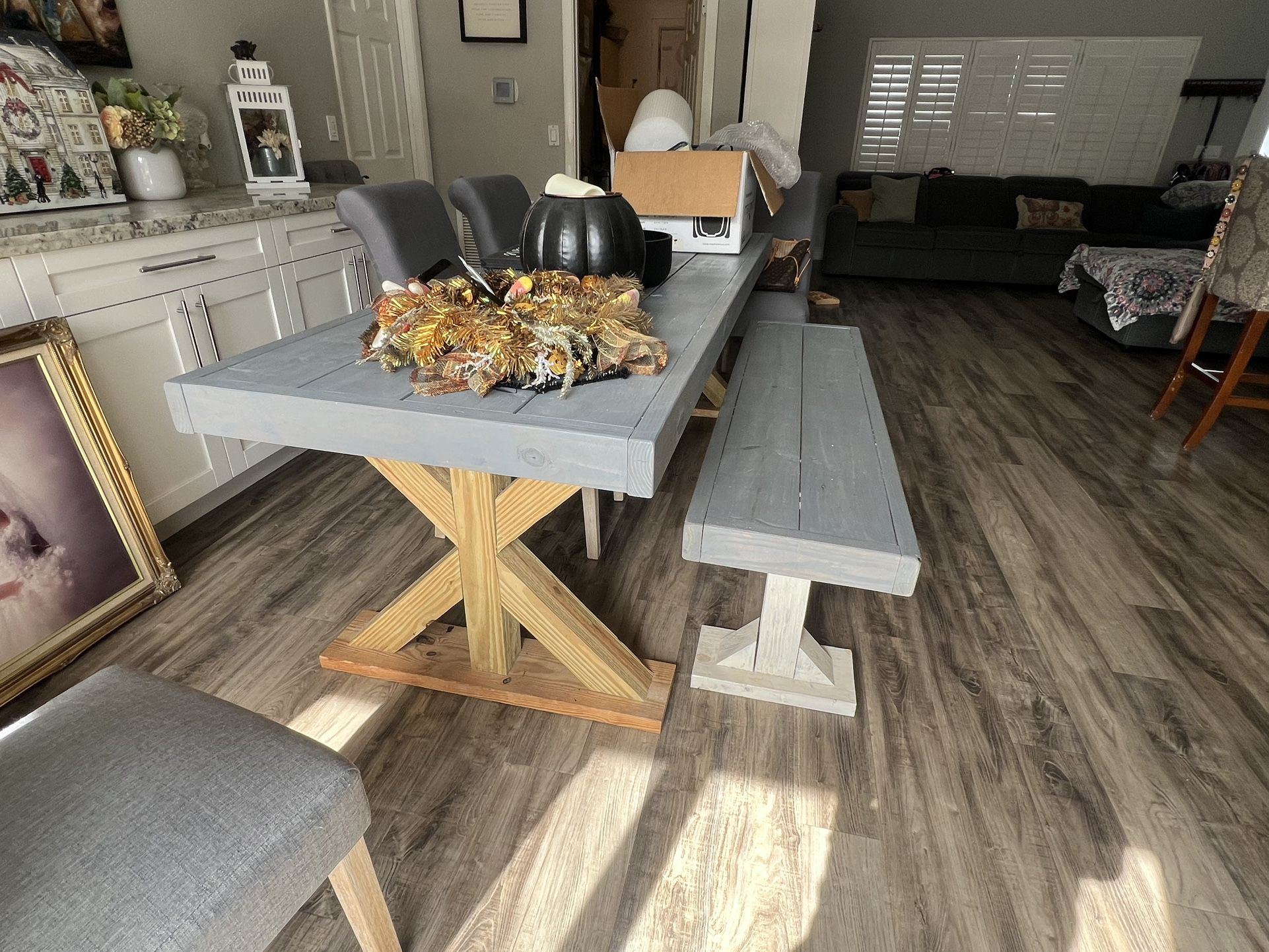 My son built this table for me a couple years ago. Solid pine, farmhouse table. I started staining it but ran out of time. It can easily be re-stained or painted. It has a matching bench and 6 chairs. The chairs have covers on them because our cats took a liking to them so you can take them or leave them. Size of table is 94x32 and bench is 68x17.