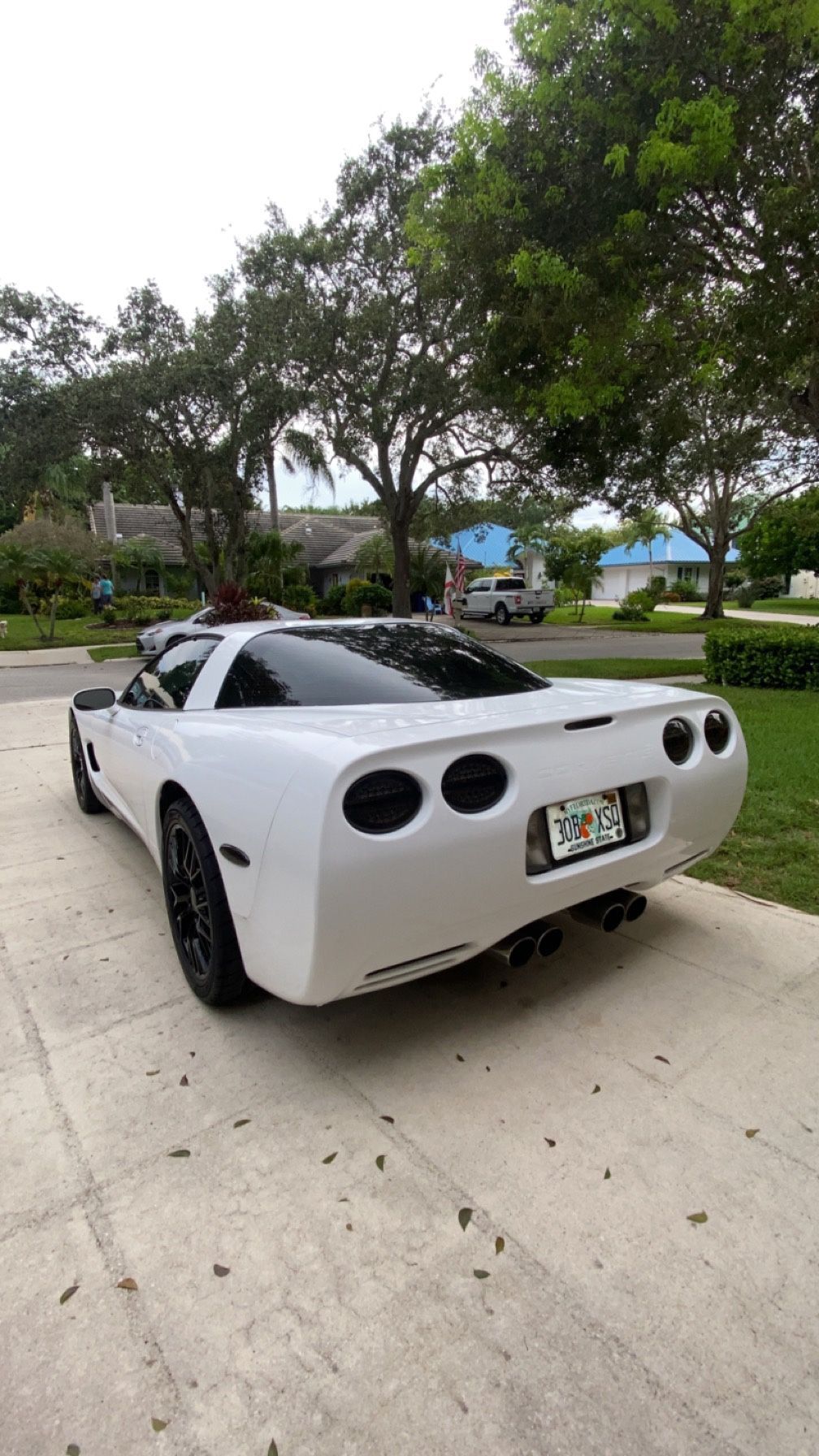 2001 Chevrolet Corvette C5 58k miles (Daily driver, will go up) Cold air intake Borla exhaust Longtube headers Wrapped White, Silver underneath C7 Z06 wheels (Black) Sleepy eye headlight kit Smoked vettelight taillights, reflectors, 3rd break light Aftermarket kenwood radio and bose speakers Has check engine light because of the long tube headers Wrap is about 2 years old and slightly peeling in a couple spots Maintained very well clean carfax