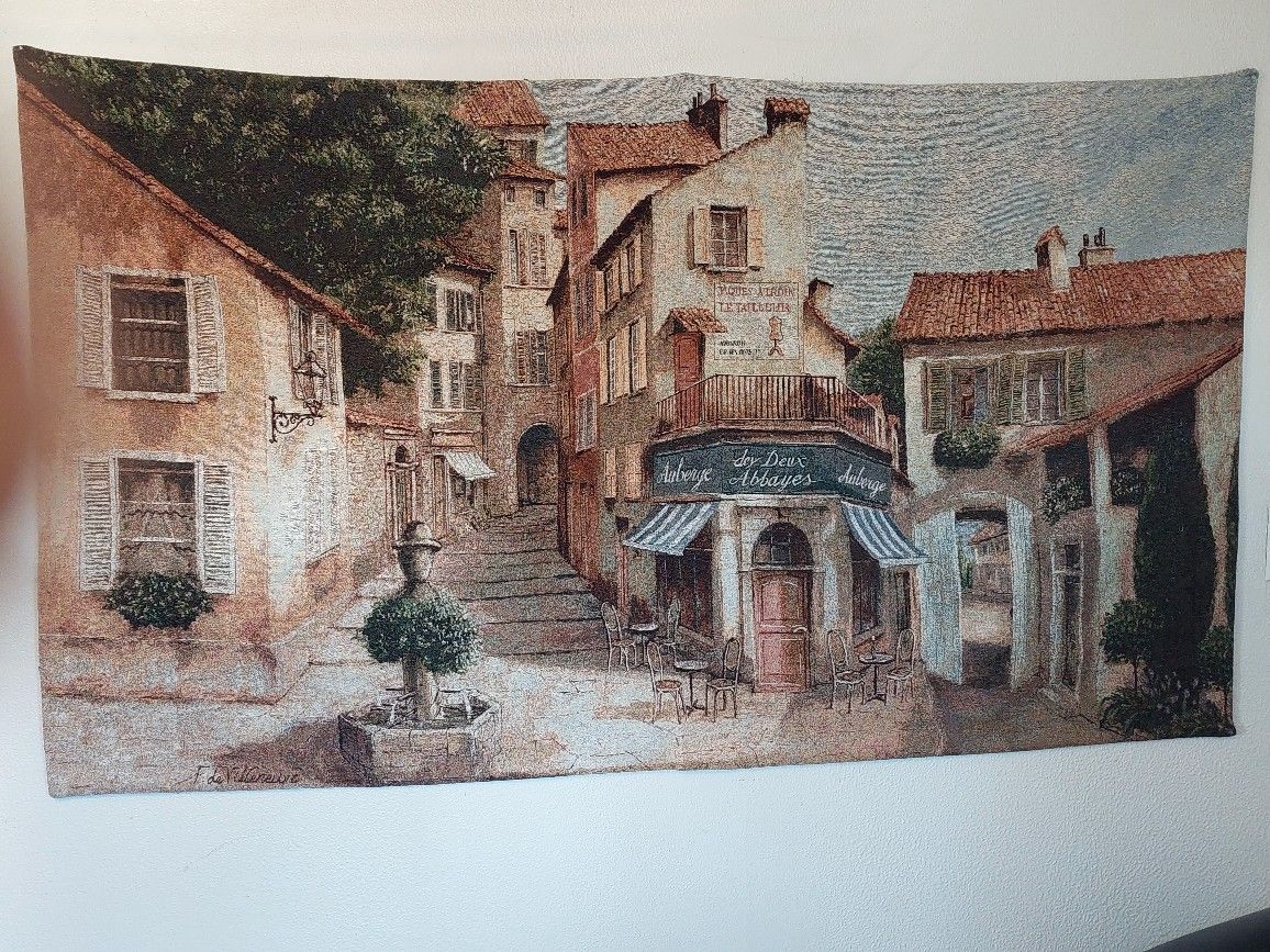 Auberge Dey Deux French street Scene Grande Tapestry Wall Hanging. Beautiful, nothing wrong with it at all. In Great Shape Asking 260.00 OBO