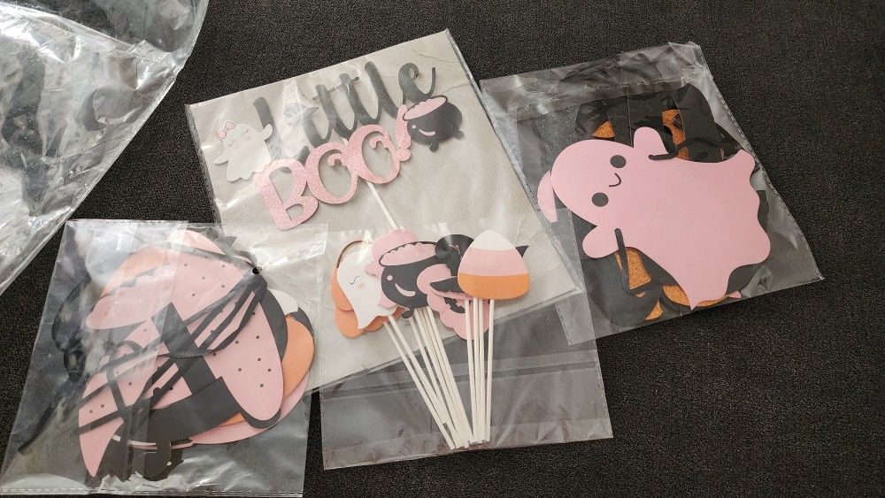 2 banners, one that says "little boo" cupcake picks and cake topper. October Halloween month
