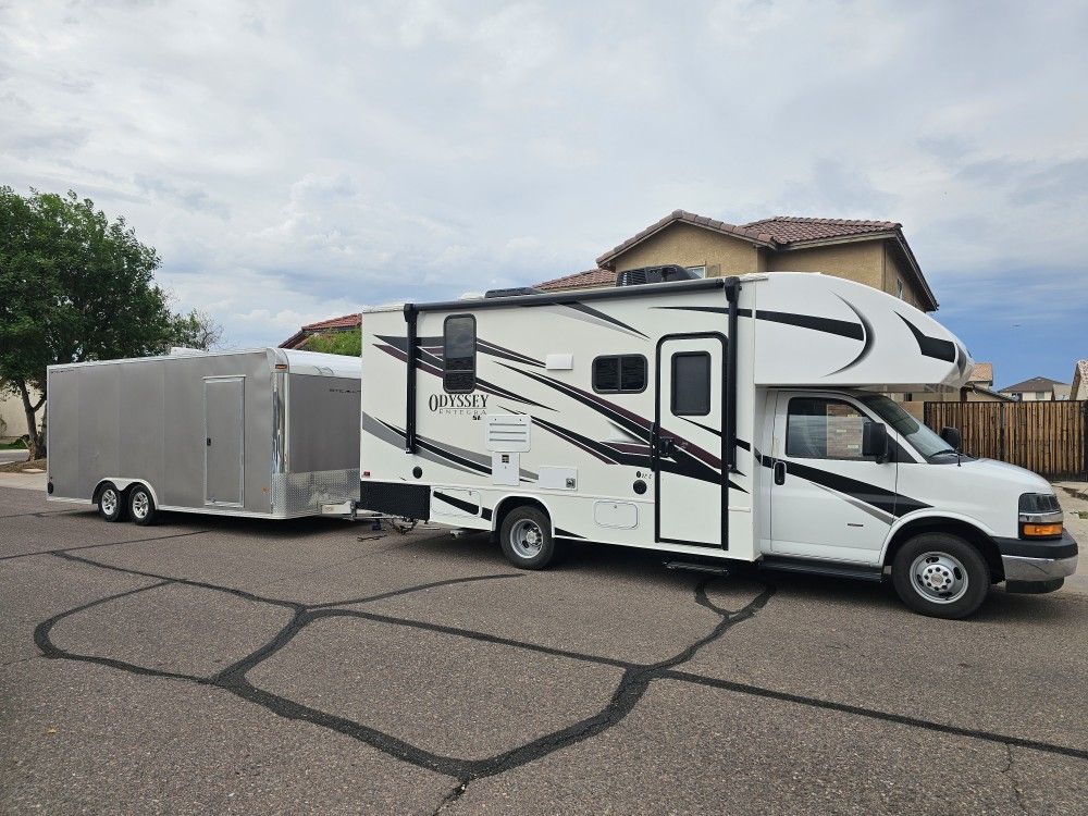 2023 Enterga Coach Odyssey SE 22C Class C. Trailer also available at additional price. 2023 Enterga Coach Odyssey SE 22C: $115,000 MSRP 2 years ago. 25ft bumper to bumper, 10,998 miles. Well equipped to tow (primary destination was Glamis, comes with 2025-2026 glamis season pass on windshield $185). Aftermarket transmission cooler installed (temps never see above 185 while towing), professionally reinforced/boxed frame in the rear, trailer brakes, weight distribution hitch setup, etc. Every bit of paperwork from new is included; owners manual, all appliance paperwork (including generator), maintenance schedule, etc. R/S title in hand, rear corner accident, now has professional outdoor kitchen installed in that area.