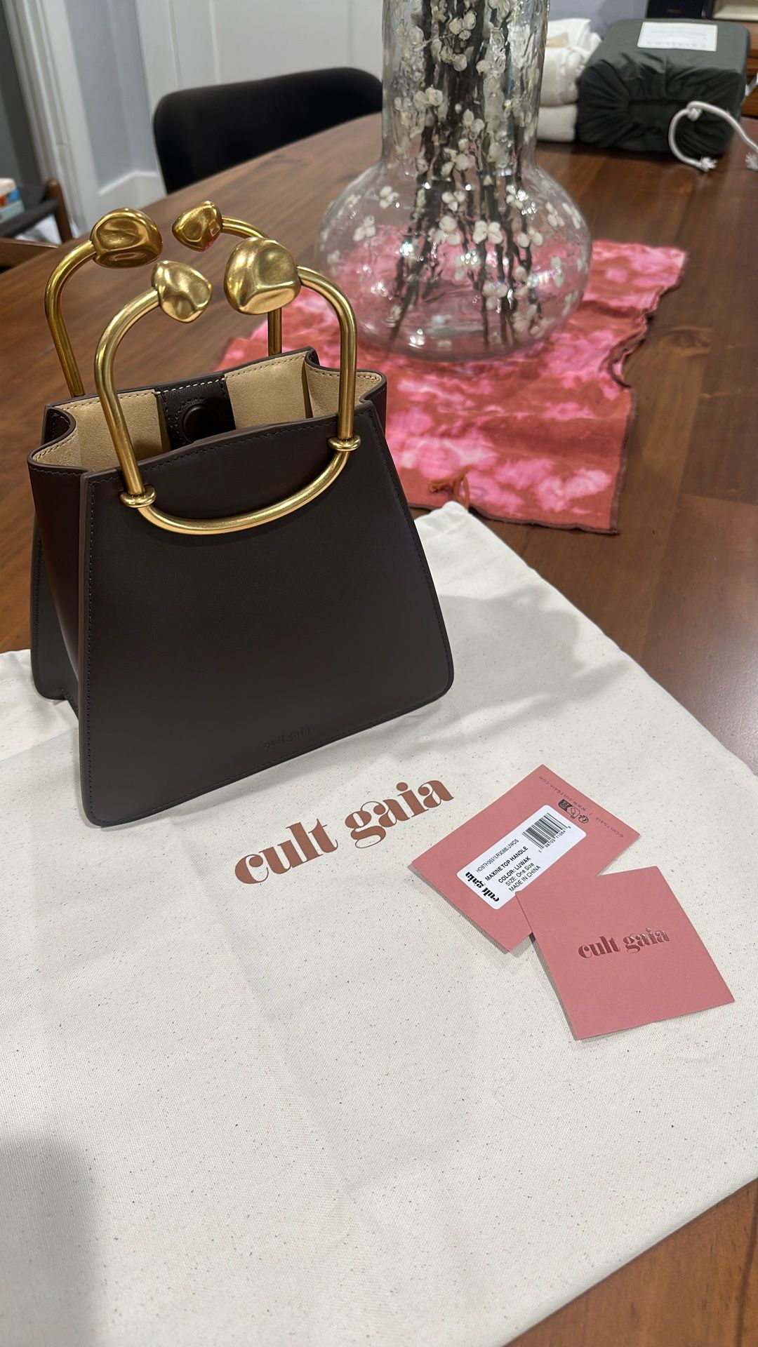 Brand new never used Cult Gaia bag will come with the dust bag. The bag is the Maxine in color Luwak which is a beautiful chocolate brown 100% leather body and brass plated handles. Size 3.94" W x 6.89" H x 7.87" L. I’m right between Mid City and K-Town in LA.