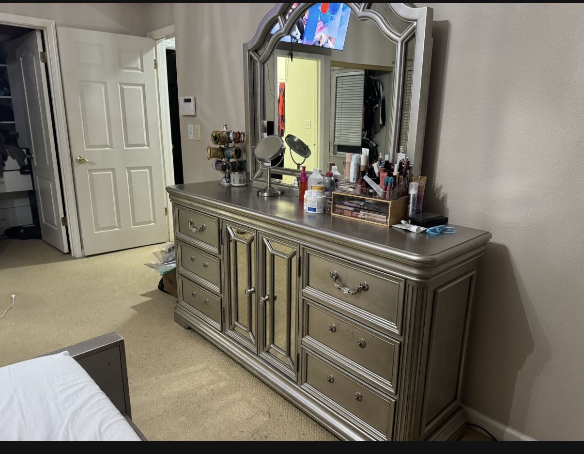 Silver and mirror 4 piece set. The fabric on back is ripping but once that is replaced the set is great to go. Also including purple mattress and king size pillows