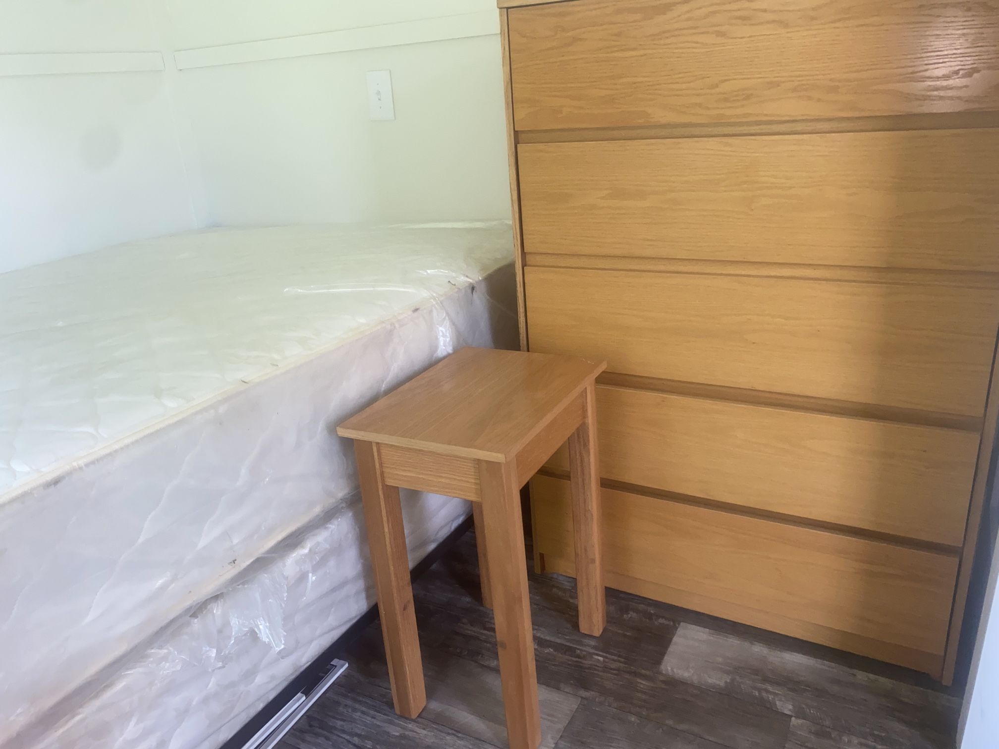 Brand new in plastic ! Full bed with box springs & Frame Includes cheat of drawers and night stand $250