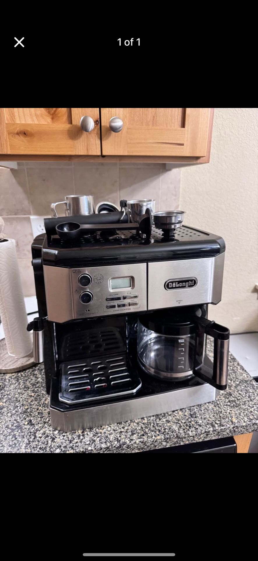 Delonghi coffee machine, makes espresso and drip coffee. Necessary accessories included