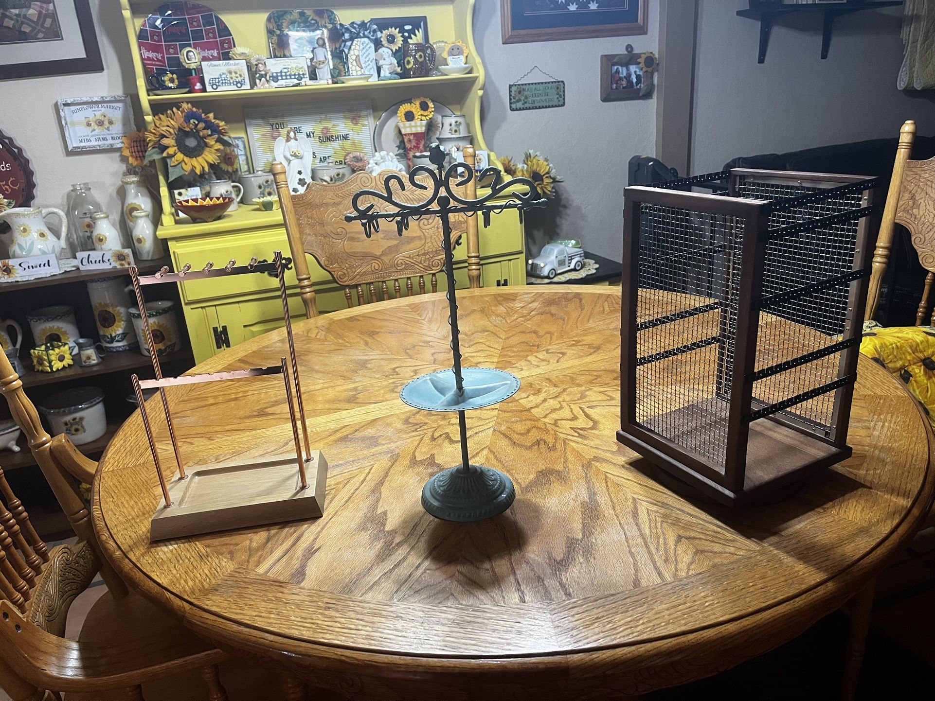 2 different jewelry stands. They don’t work with my longer chain necklaces so bought a wall mounted one. $10 each. Square one has been sold. Must pick up near 38th Street and Thomas.
