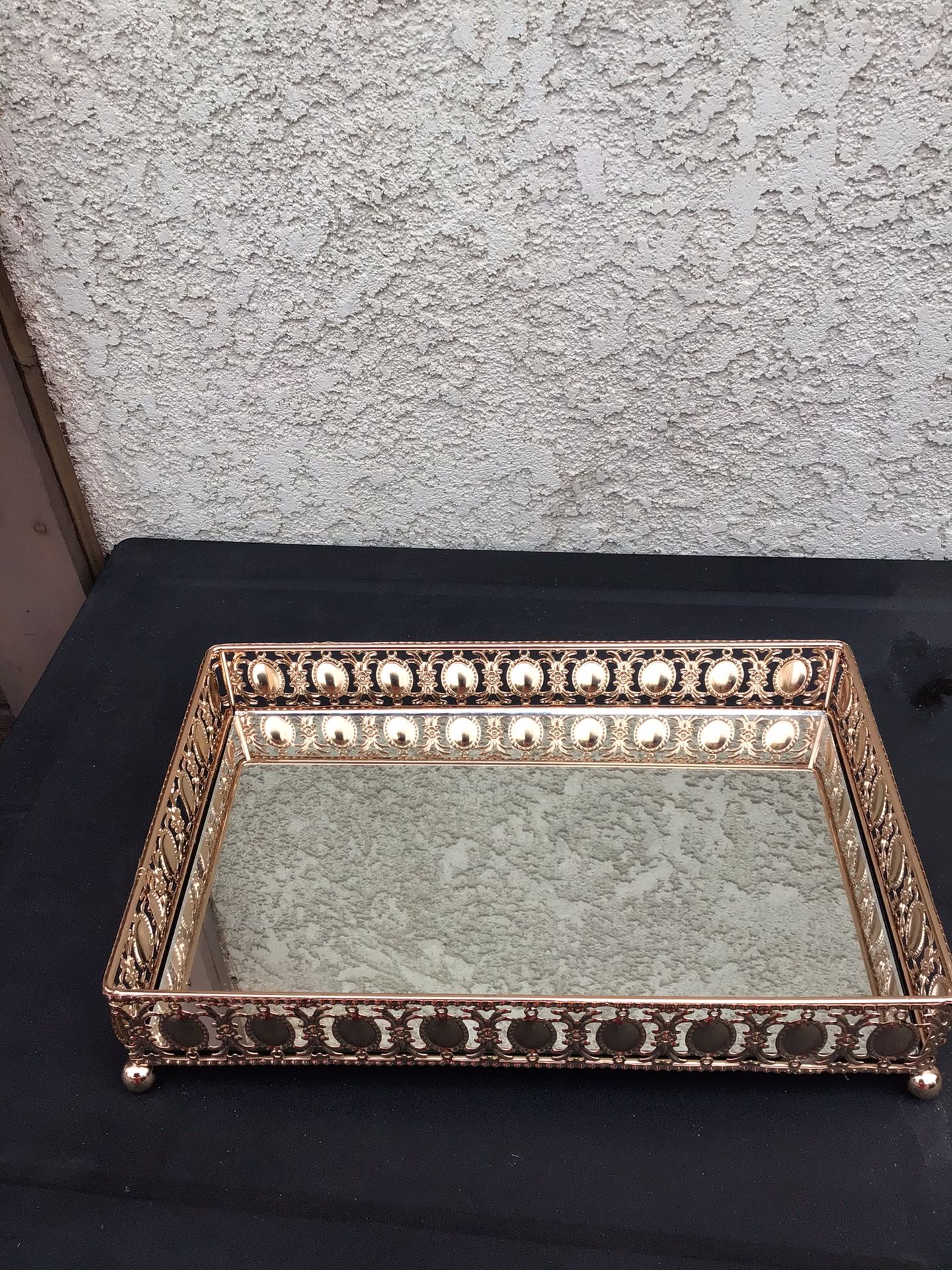 Beautiful rose gold serving tray with mirror inside. Could also be used for decorative purposes.