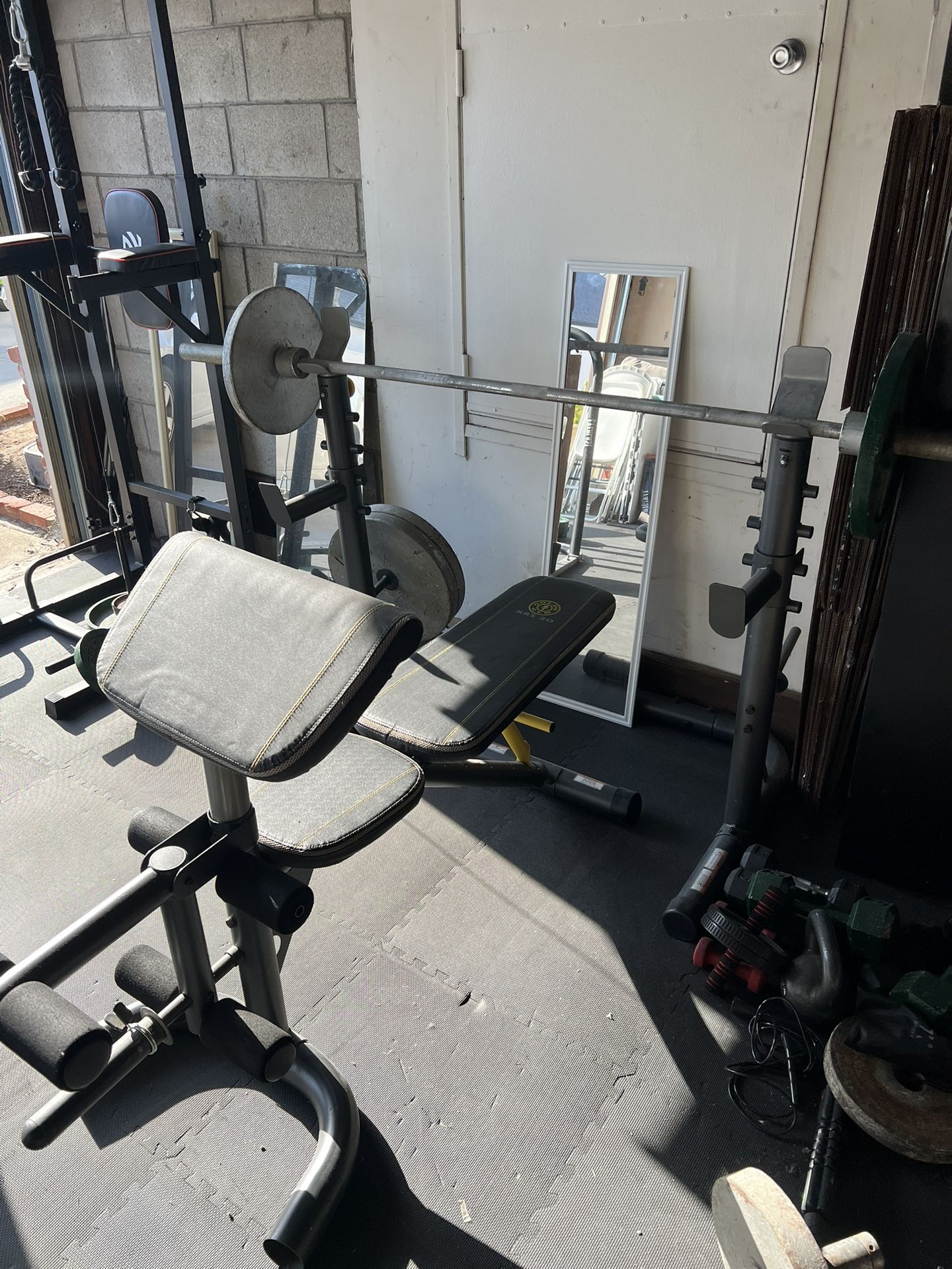 Incline bench includes attachments for arm workout and leg workouts. Weight plates are included! Plates included are: 2 of the 45lbs 4 of the 35lbs 4 of the 25lbs 2 of the 10lbs 2 of the 5lbs Willing to sell plates separately. Serious inquiries only please. Pick up only, please bring your own tools.