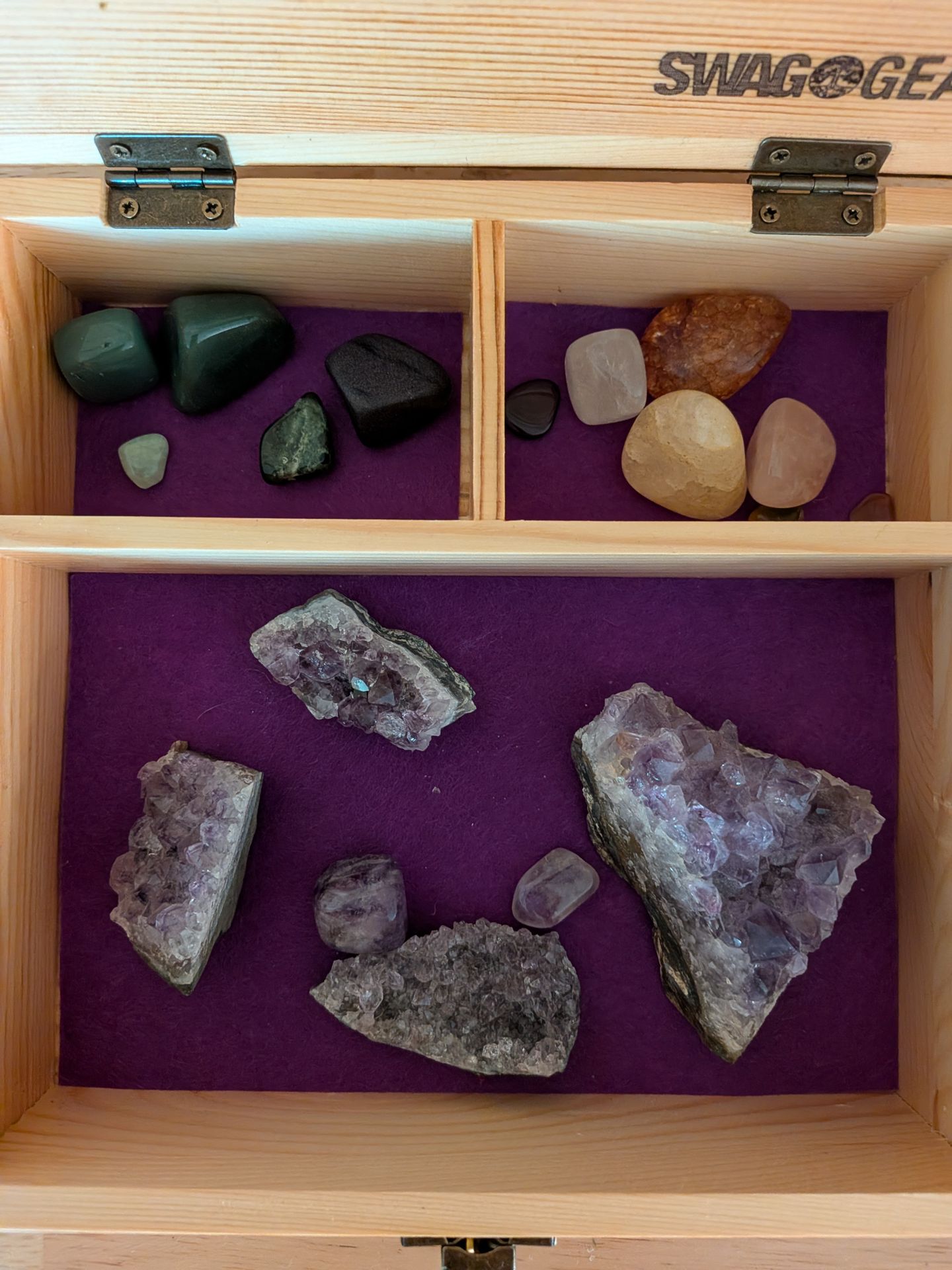Beautiful, wooden box with compartments and latch. Filled with an assortment split crystals, tumbled stones, etc. Total of 17.