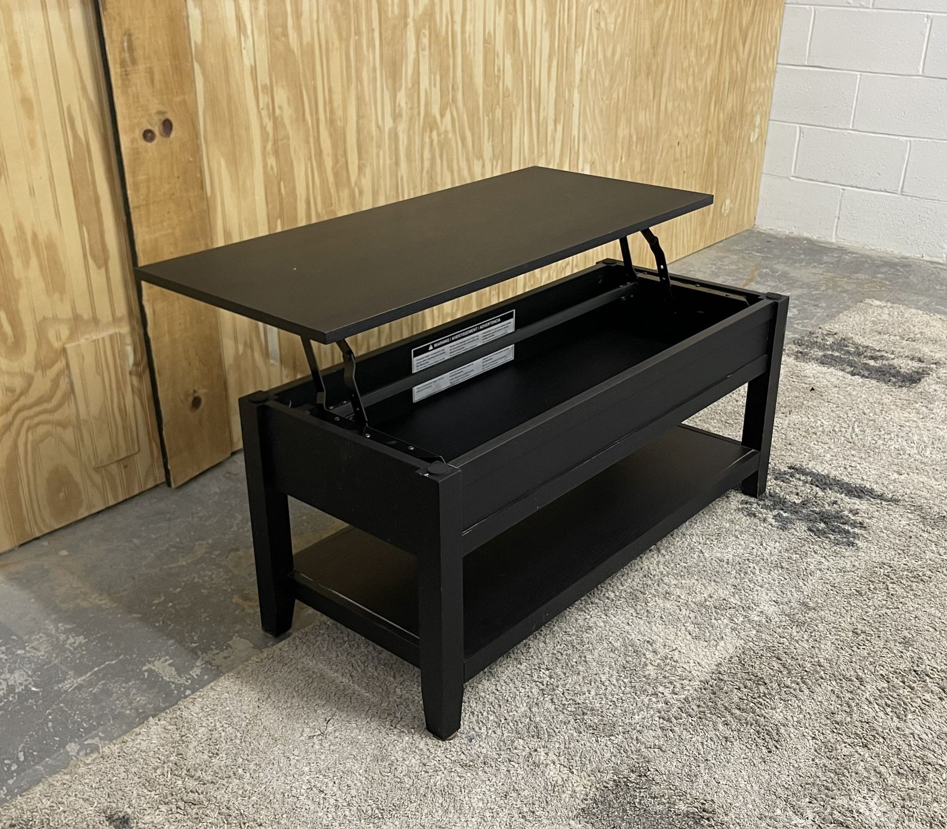 Used black lift top coffee table for sale In good shape, top lifts up for storage underneath. Measures about 41” wide, 18” deep & 18” tall. About 24” tall when lifted up $60 Located in north Lubbock. Delivery available for $25