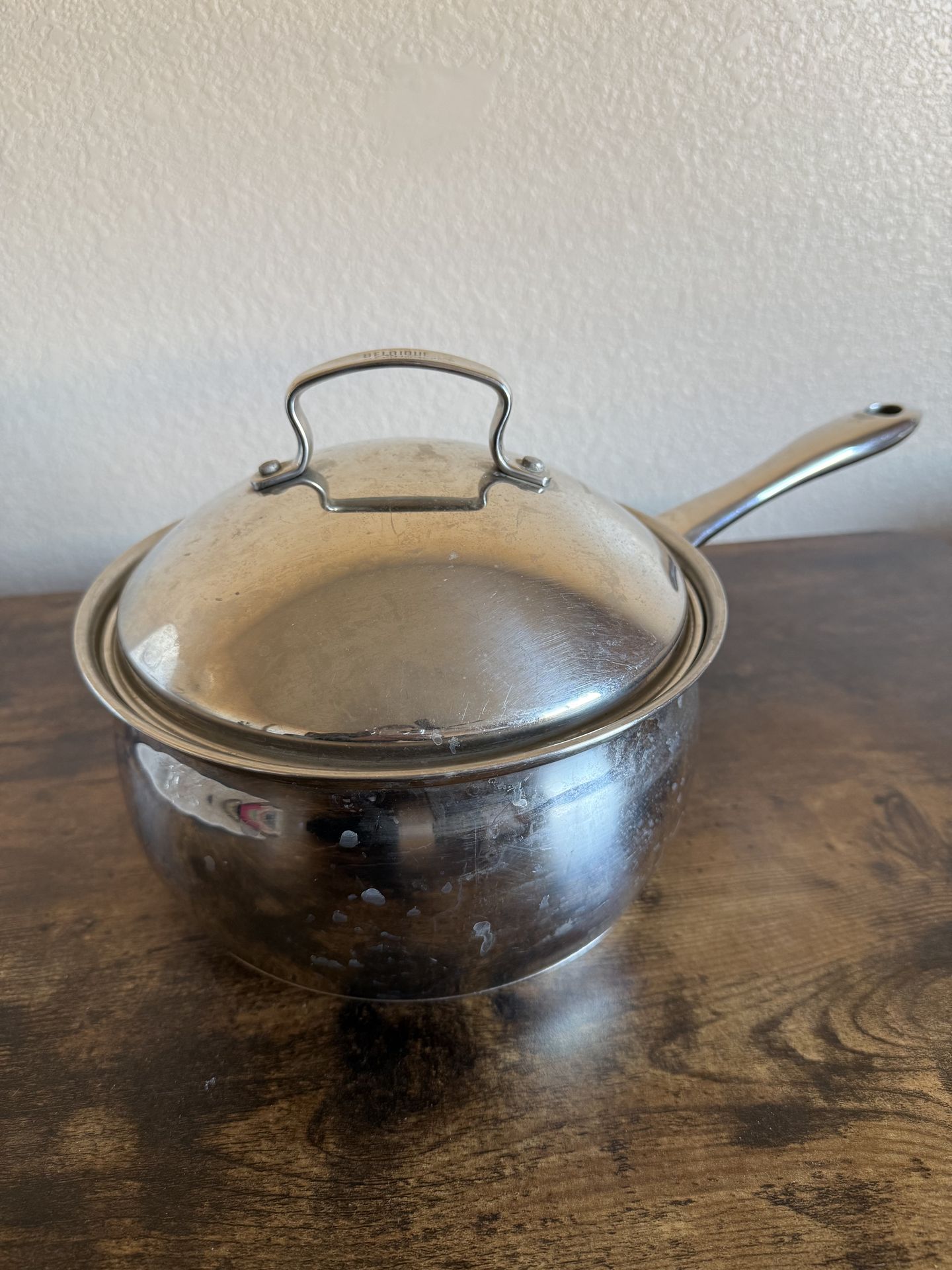 Vintage Classique Belgique 3.5Qt SaucePan. Comes with a dome lid that has two holes to ventilate. It has normal wear and in great condition. It can hold up to 3.5Qt. Asking $40 for it.