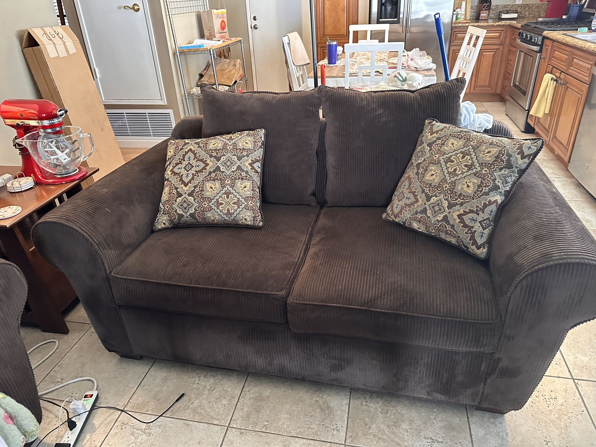 Brown fabric love seat. Decent shape. 72” wide x 40” deep. Matching sofa available.