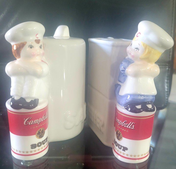 Material ceramic These are marked 1996 on bottom. The salt shaker is round with little boy sitting on a can of soup with2 holes and is 3 3/4" tall, top of boys hat. The pepper shaker has a little girl sitting on the soup can, also 3 3/4" tall. Both shakers are in excellent vintage condition with no chips or cracks. This is a collectors edition Never Used. I don't ship