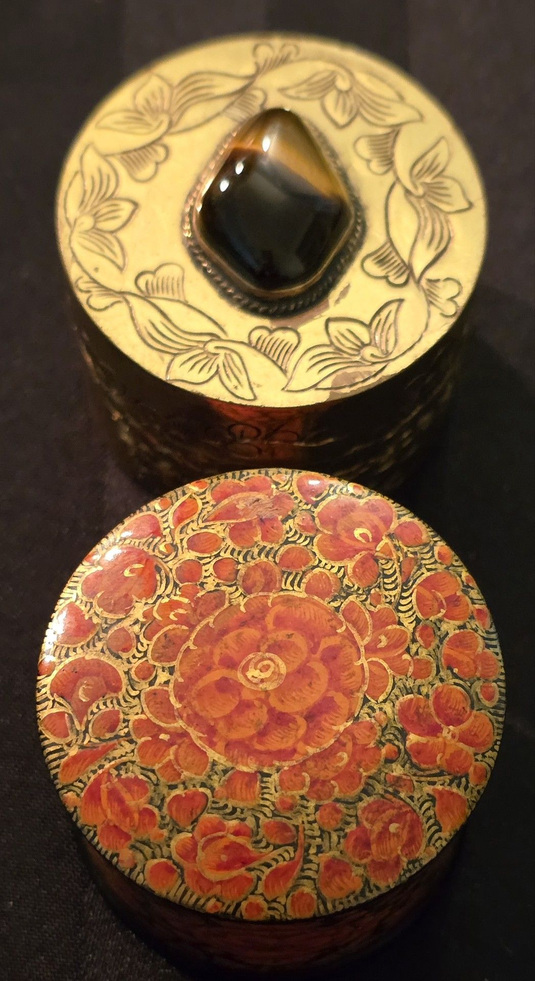 This product is a vintage set of two solid brass stamp holders, one made in Hong Kong which is the goldtone with the tigers eye stone on the lid and the other one is painted with flowers made in Kashmiri India. Additionally, it includes a wooden holder for storing stamps. These pieces are likely to be collectors. The craftsmanship and origins of the holders add an extra layer of interest and value to the set. They both show some wear on them, inside and out. They are from like the 70's. My in-laws purchase them in India and Hong Kong. They used them for stamps. You can us them for jewelry if you want. They are very cool and interesting.
