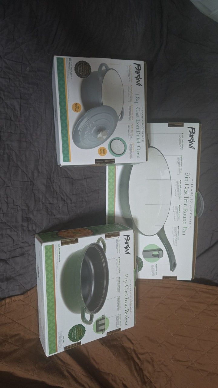 - 1.8 qt. Cast Iron Dutch Oven - 9 in. Cast Iron Round Pan - 2 qt. Cast Iron Braiser By Parini All sealed!