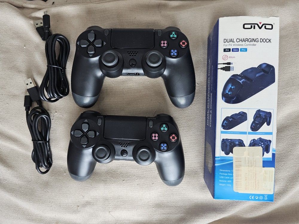 This is a set of: (2) Playstation P4 Remote Controls. (1) Dual Charging Doc for two P4 Wireless Controllers by OVIO. ALL ARE BRAND NEW AND IN BOXES!!! NEVER USED. (Only taken out for pics.) (Regular price listed on Amazon is $133)