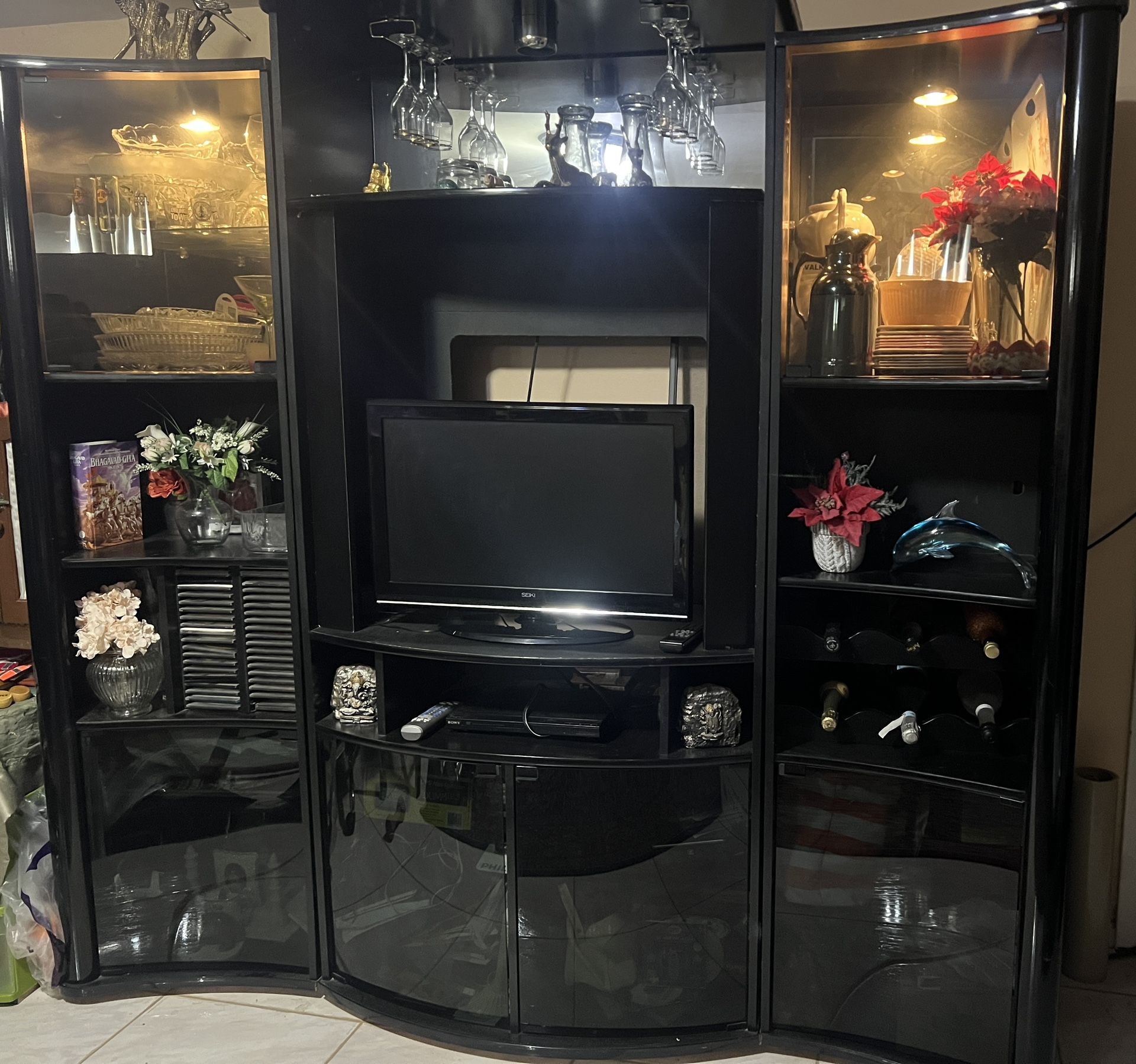 Black glass door 3 pieces entertainment center they can fit up to 32”-34” TV. 40 plus CD compartment 6 beverage bottles space. All 3 have lights inside. 22” Wide both side corners 36” wide middle one. Height is middle one 79” and both sides are 74” heights.
