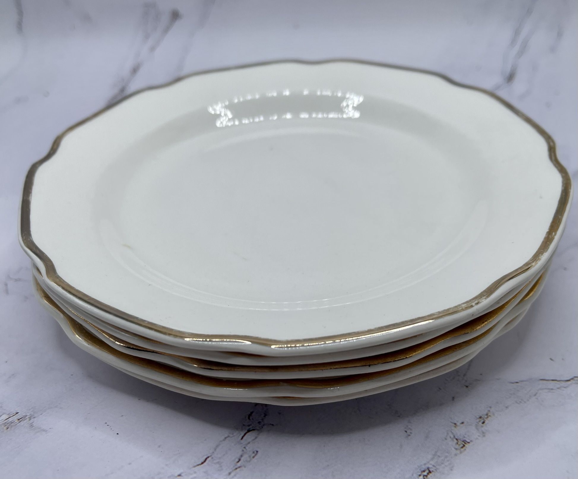 Antique 5 White Bread/Appetizer Plates With Silver Edge Please notice: volume & shipping discounts for purchases of multiple items PRICE & WEIGHT is for ALL Plates Plates can also be purchased individually - $5 Was helping a friend to clean his grandmother’s house & we have found a treasure of incredibly beautiful sets of old china as well as many stand alone pieces suitable for replacement/addition to the existing collections. I hope they can find a good home. This is a set of 5 bread/appetizer plates with scalloped silver edges in EUC. No stamps or marks. I made a picture of creasing on the back of one of the plates (as far as I was explained they are little wavy imperfections on some pieces of pottery made before 1950s). I only found it on one but maybe under certain angles and bright lights you can find them on others. Considering plate’s age - made before 1890 because that’s when grandma moved to MA - they are in a great shape. Diameter 6 in Weight is 1 lb