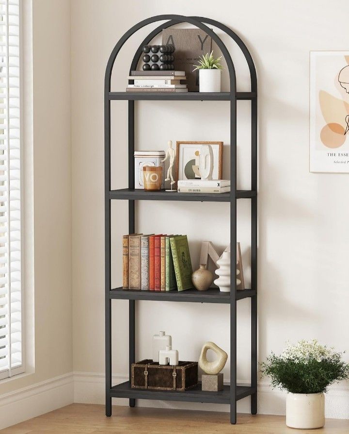 Bookshelf 4 Tier Arched Bookcase, 71.3" Tall Industrial Open Book Shelves for Living Room, Modern Freestanding Display Shelving Unit Storage Rack with Metal Frame, Office, Bedroom, Black