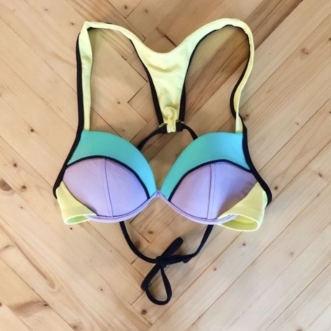 Xhilaration neon colorblock style racerback bikini top in yellow, green, and purple, with black trim. Racerback style with adjustable tie strap in the back. Push-up / padded style. Size XS. Worn once - EUC excellent used condition. Top only! Bottoms sold separately. E20