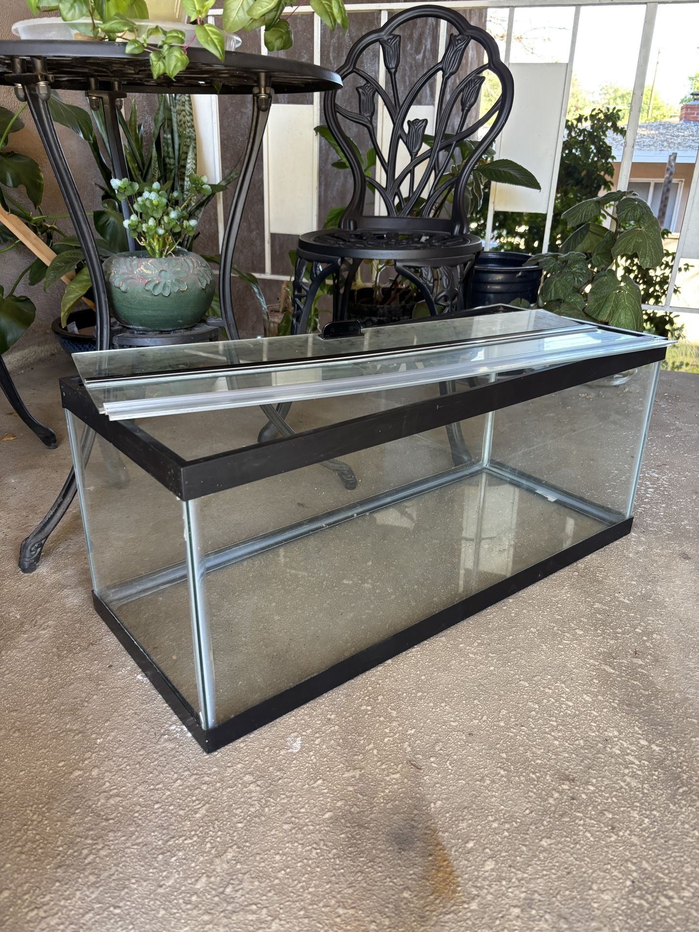 20 gal long. Holds water. Warped plastic corner (top left) Fitted glass lid with small crack in middle Good for fish, reptiles, or terrarium OFFERS ACCEPTED