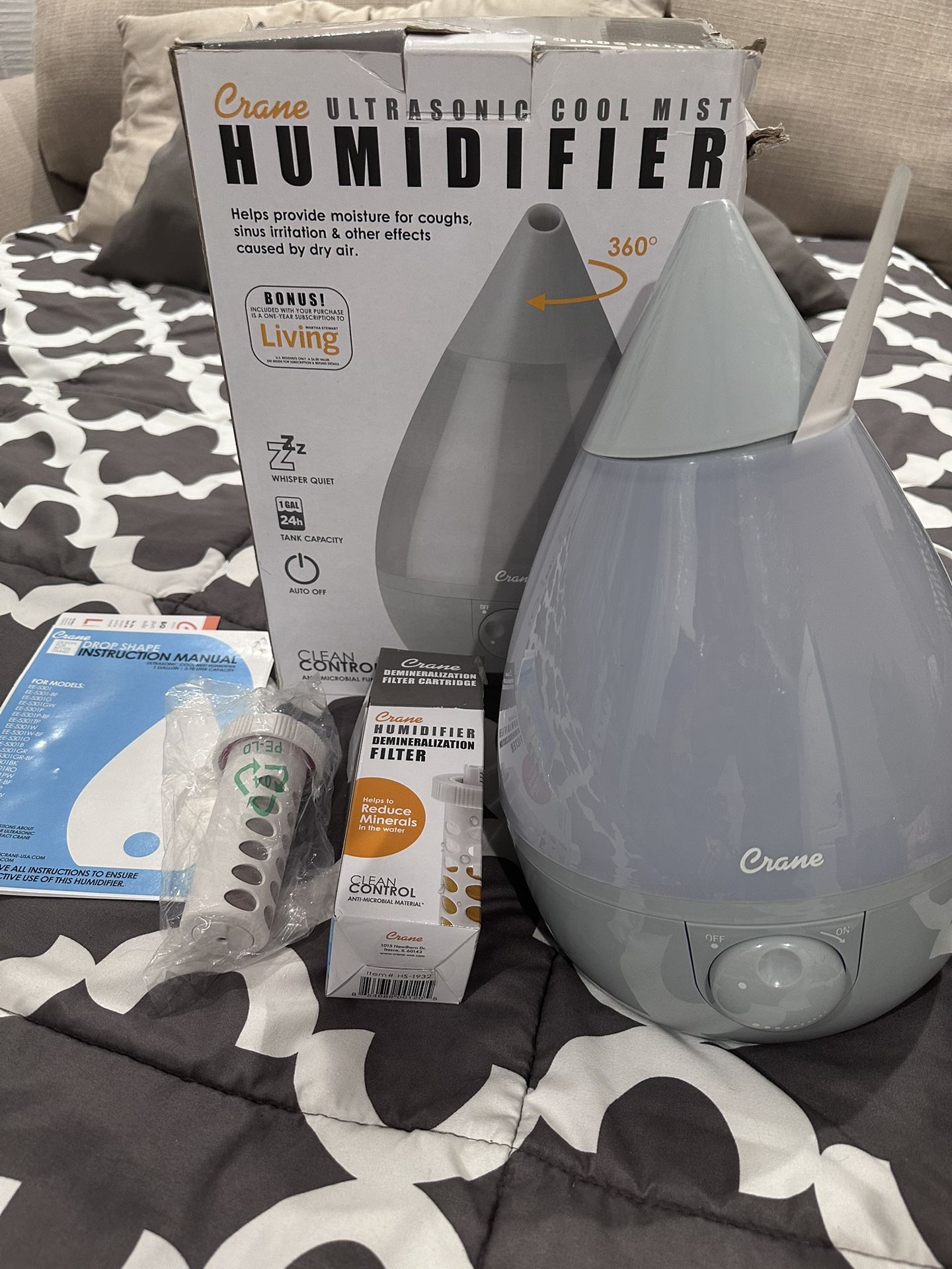 Crane Ultrasonic Cool Mist Humidifier, available in a gray color. This humidifier is designed to provide natural, non-medicated relief from symptoms caused by dry air, such as coughs, sinus irritation, nasal congestion, and dry skin. Key Features Ultrasonic Cool Mist: The unit uses ultrasonic technology to produce a fine, cool mist, making it a safe choice for use around children and babies. Capacity & Run Time: It features a 1-gallon (approx. 3.78 liter) tank that can run for up to 24 hours in rooms up to 500 square feet. Clean Control: The base is made with antimicrobial material to help reduce mold and bacteria growth. Adjustable Output: A control knob allows for variable mist output settings to reach your desired comfort level. Automatic Shut-Off: For safety, the unit automatically turns off when the water tank is empty. Optional Filter: The humidifier has an optional slot for a demineralization filter (Model HS-1932 is pictured) to help reduce "white dust" caused by minerals in hard water. Pick up Opened but never used, was a gift.