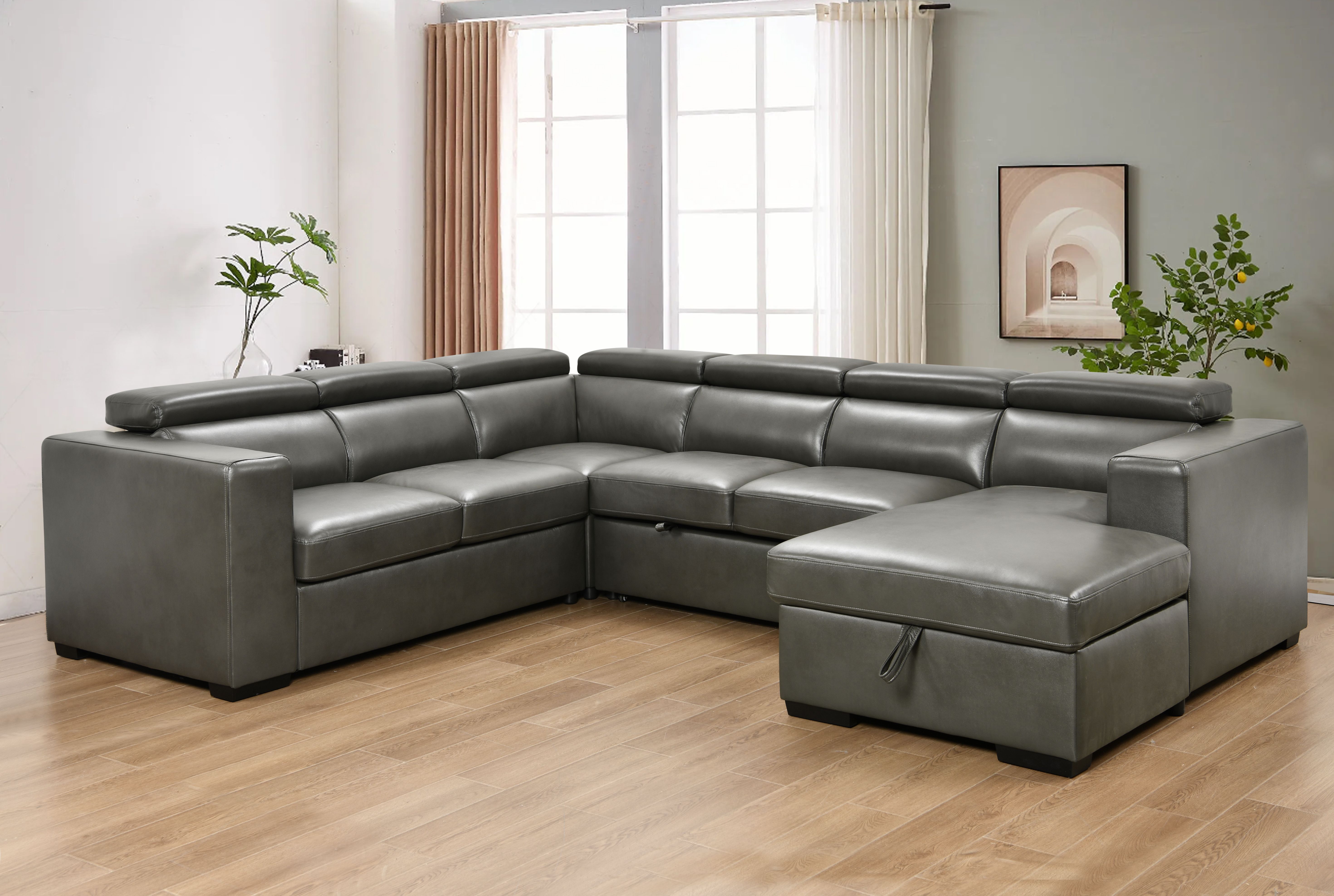 123" Modern U Shaped 7 Seat Sectional Sofa Couch With Adjustable Headrest, Sofa Bed With Storage Chaise Pull Out Couch Bed For Living Room ,Gray Light Brown Wood Primary Living Space Heavy Duty Eucalyptus 7 Seat Gray Faux Leather Soft Cushion Back Modern Characteristics: [4 in 1 sectional sleeper sofa]: This sectional sleeper sofa consists of 4 parts: 1x chaise lounge, 1x armless loveseat with pull out bed, 1x loveseat with arms, 1x corner sofa. It is very easy to assemble this sectional sofa into a U- shape sofa or a pull out sleeper for everyday use or unexpected guests, study, home office or bedroom living room. [Multi-functional sofa ]: Functional headrests bring you all kinds of comfort and support, comfortable waist pillow Just to give you a better feeling; Sleeper bed mechanism ; Strong ,safe and easily pull out ; As a couch, it fits in home office/guest room perfectly. As a bed, the full size mattress is great and works with full size sheets. [Living room furniture set]: Sectional sofa with right storage chaise and pull out bed, great living room furniture set in home or office, club. modern and stylish. [Comfortable sectional sofa with storage chaise]: The upholstered backrest and the springs offer great support for you to relax comfortable. The upholstered storage chaise offer convenient space for putting small items like your blankets, magazines, pillows, well save your space and keep the living room clean. [ Durable & Sturdy Pull Out Bed ] : Lift up and out in one smooth motion without squeaking, turn any room into a bedroom or guest room with bed couch easily and quickly. Solid wood and plywood frame, Pocket Coil Seating + High-density foam seat cushion; Firm frame ensure the sleeper couch longer lifespan.