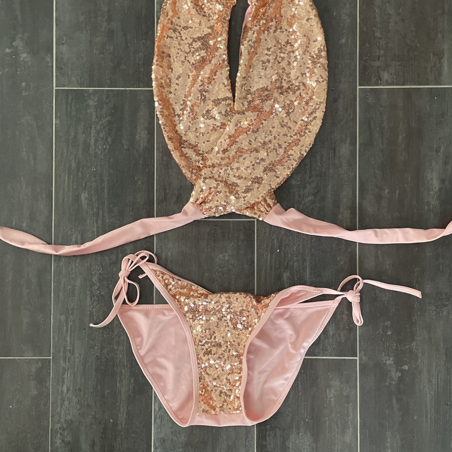 Never worn swimsuit. Pretty sequins with metal neckpiece. Nice for photos