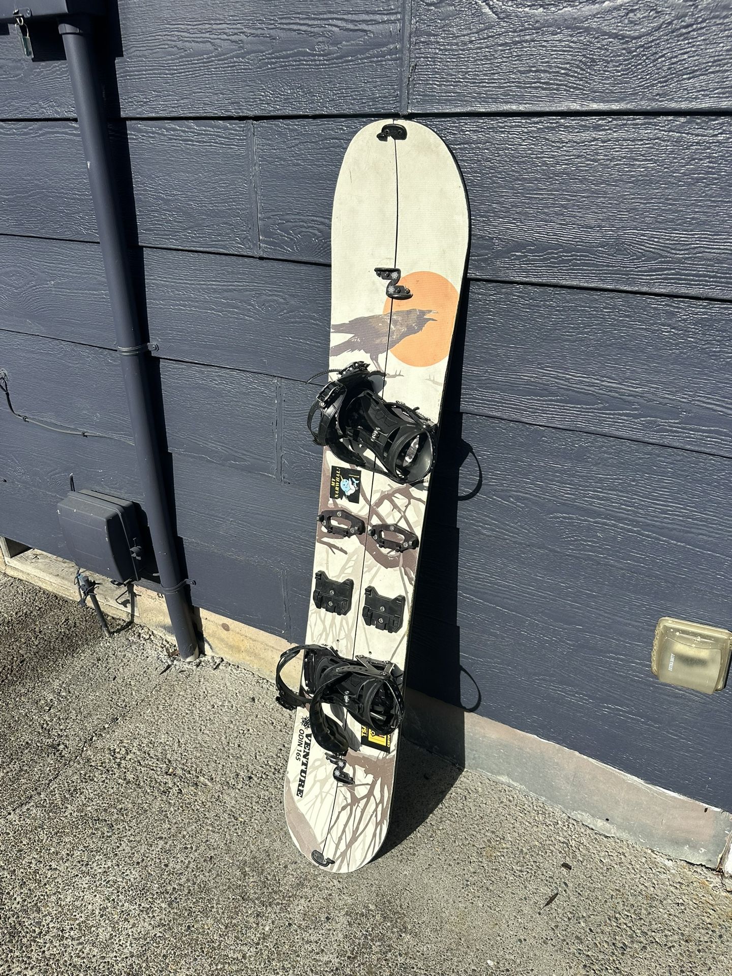 Venture Odin 164. This board is a hard charger, and rides well in all conditions. It has been well used. Perfect for someone who wants to try out split boarding. Some delamination, scratches, repaired base gouge, binding has a crack and repaired by JB Weld. Comes with skins, bindings, pucks, and extra binding hardware.