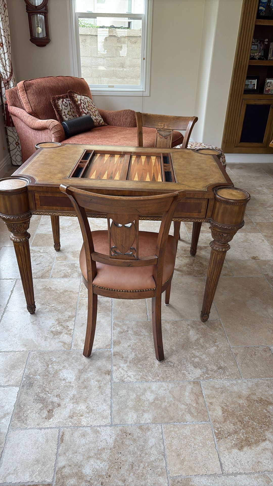Solid Wood Game Table with Chairs 2 drawers for storage Some chipping on (1 side see photo) otherwise a beautiful piece of furniture Chairs have fading on wood and leather.