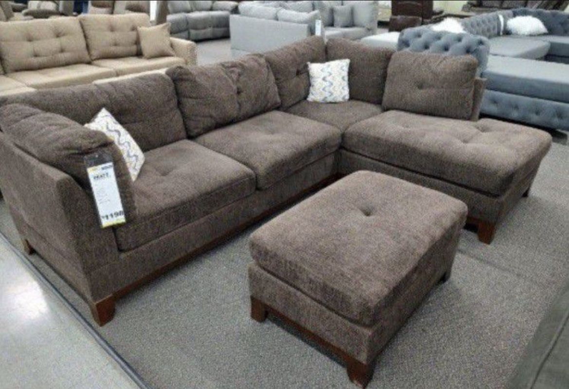 Brand new in 3 boxes Never opened Brown chenille set Sectional with reversible chaise and ottoman. Sectional measures 105”x75”x35”H. Delivery available for additional fee depending on your location