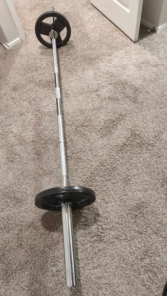 Cap Olympic Bar bell 7ft 2x25lbs cast iron weights also by Cap 2 clamps pair perfectly with the barbell, holds on tight Never used, open box condition, not even a scratch on them selling together for only $80, cost $140+tax