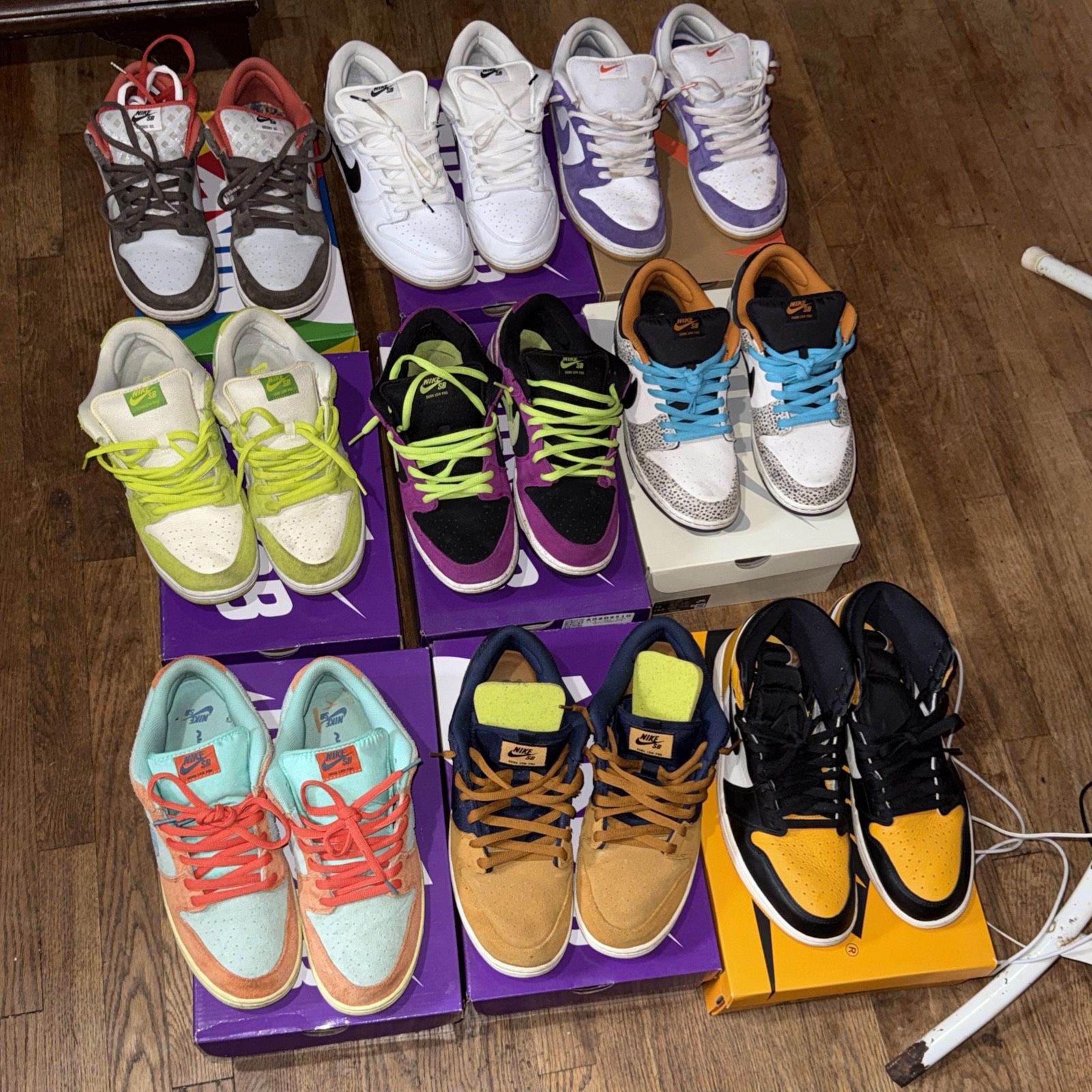 9 pairs Nike sb dunk low and one Jordan 1 Taxi high size 13 Red Plum, quartersnack, crushed, green apple, backpack, and more