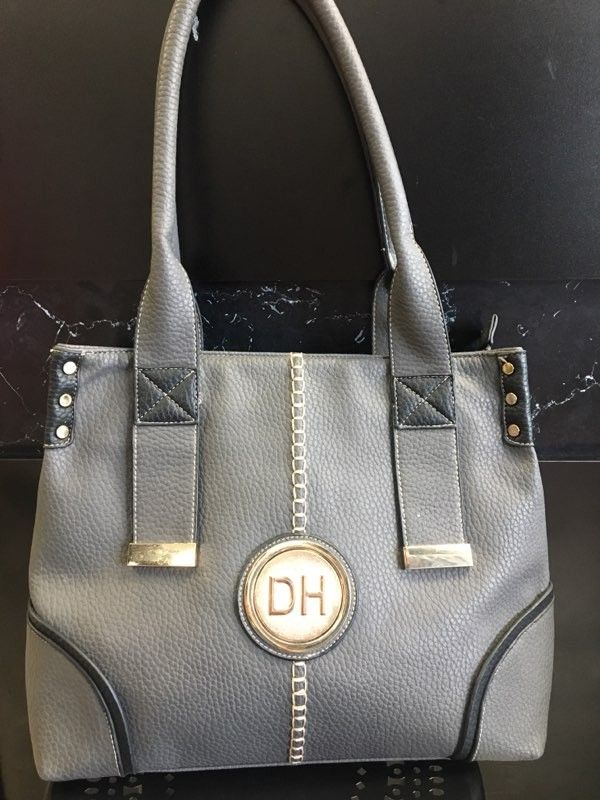 DH Grey and black tote with cream stitching. 22in x 14in x 4in with shoulder strap and 11in x 14in x 4in without shoulder strap