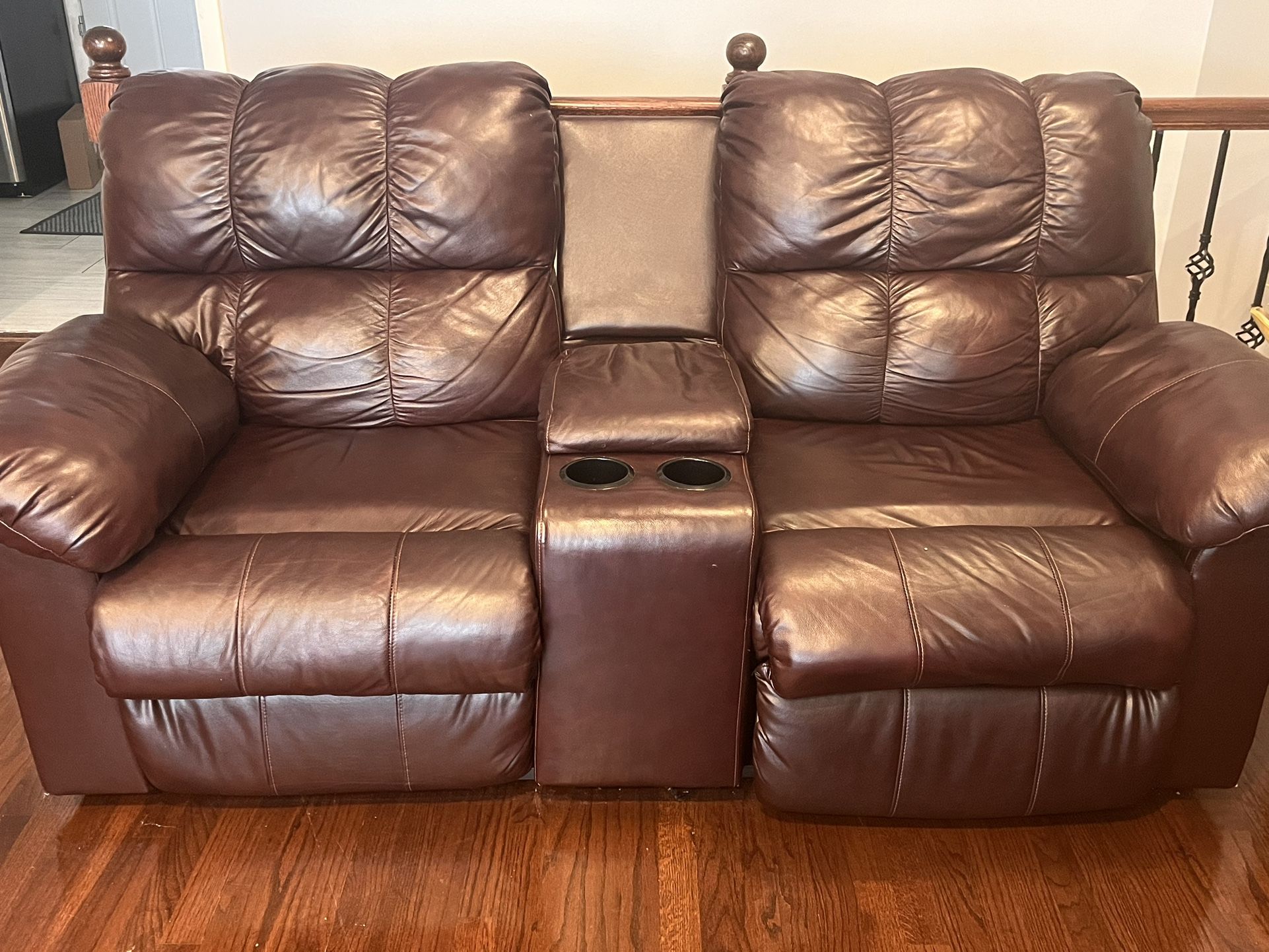Faux leather, dual recliner, perfect condition, smoke and pet free home. Perfect for a basement or TV room. We are on Main and McCormick
