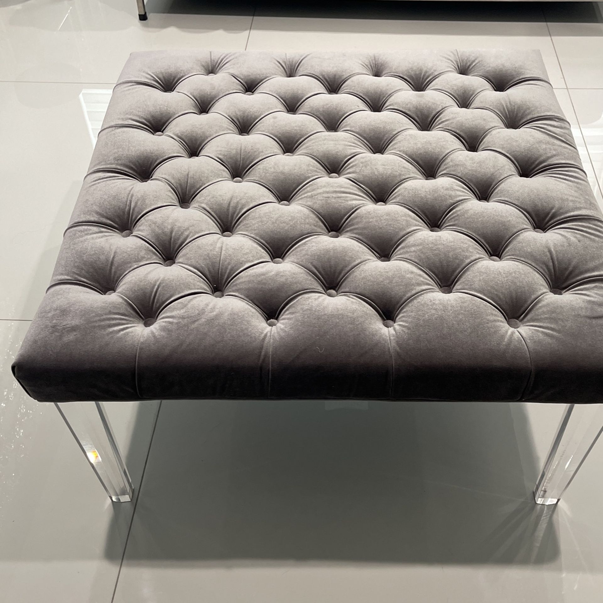 A beautiful tufted gray ottoman velvet with acrylic legs. 42x42x 19. Hardly used